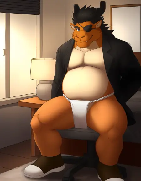 関連ワード:黒髪、とげとげした髪、長い髪、男性の陰毛、へそ毛、顔の毛、ひげ、乳首なし、オレンジ色の肌、オレンジ色の毛、濃い眉毛、分岐した眉毛、ドラゴンボーイ、ドラゴンの尾、ドラゴンの角、ツノ、黒いスーツ、フォーマル、長袖、開いた服、ピストライプパターン、縦縞、ラペル、カラーのシャツ、茶色の靴、白い靴、ネックレス