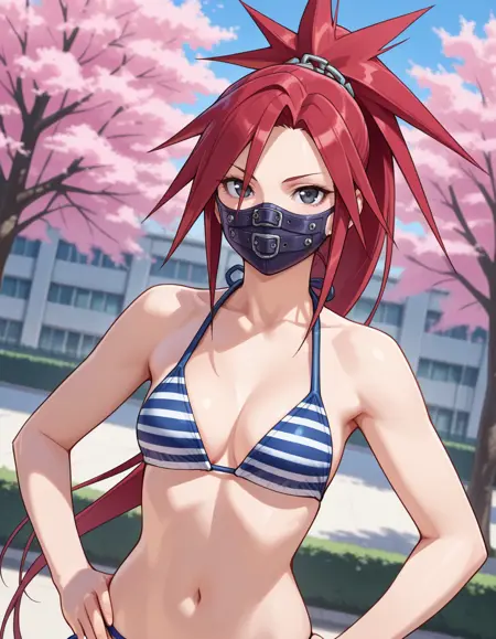 プロンプト例: Masterpiece, hires, ((solo)), anime, newest, detailed face and eyes, absurd detail, awesome picture, detailed skin, Beautiful background, dynamic pose, duch Angle, ((Half body)), school, outside, blossom tree, 1girl, project_zaki, solo, ponytail, long hair, spiked hair, mouth mask, school uniform, ornament chain hair, black glove, black eyes, red hair, pelvic curtain , bodysuite, front view, hand on hips, <lora:Project_Justice_Rival_Schools_-_Zaki_Aoi_Himezaki:0.80>,