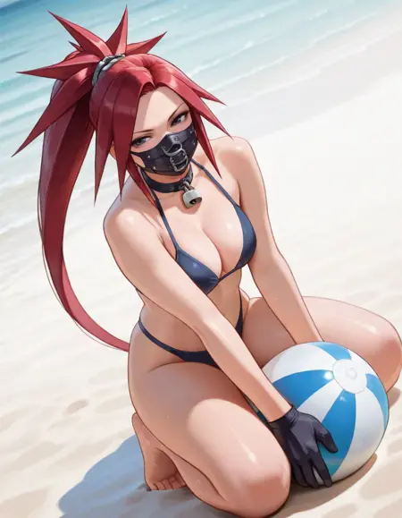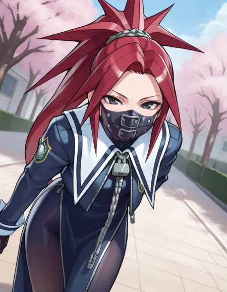 Prompt Basic Outfit: 1girl, project_zaki, solo, ponytail, long hair, spiked hair, mouth mask, school uniform, ornament chain hair, black glove, black eyes, red hair, pelvic curtain , bodysuite, front view, hand on hips,