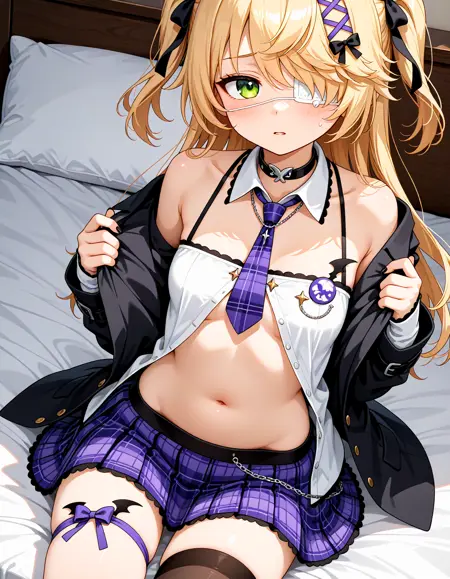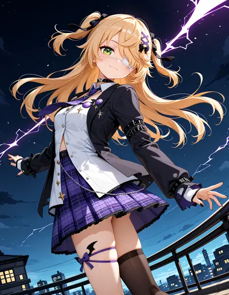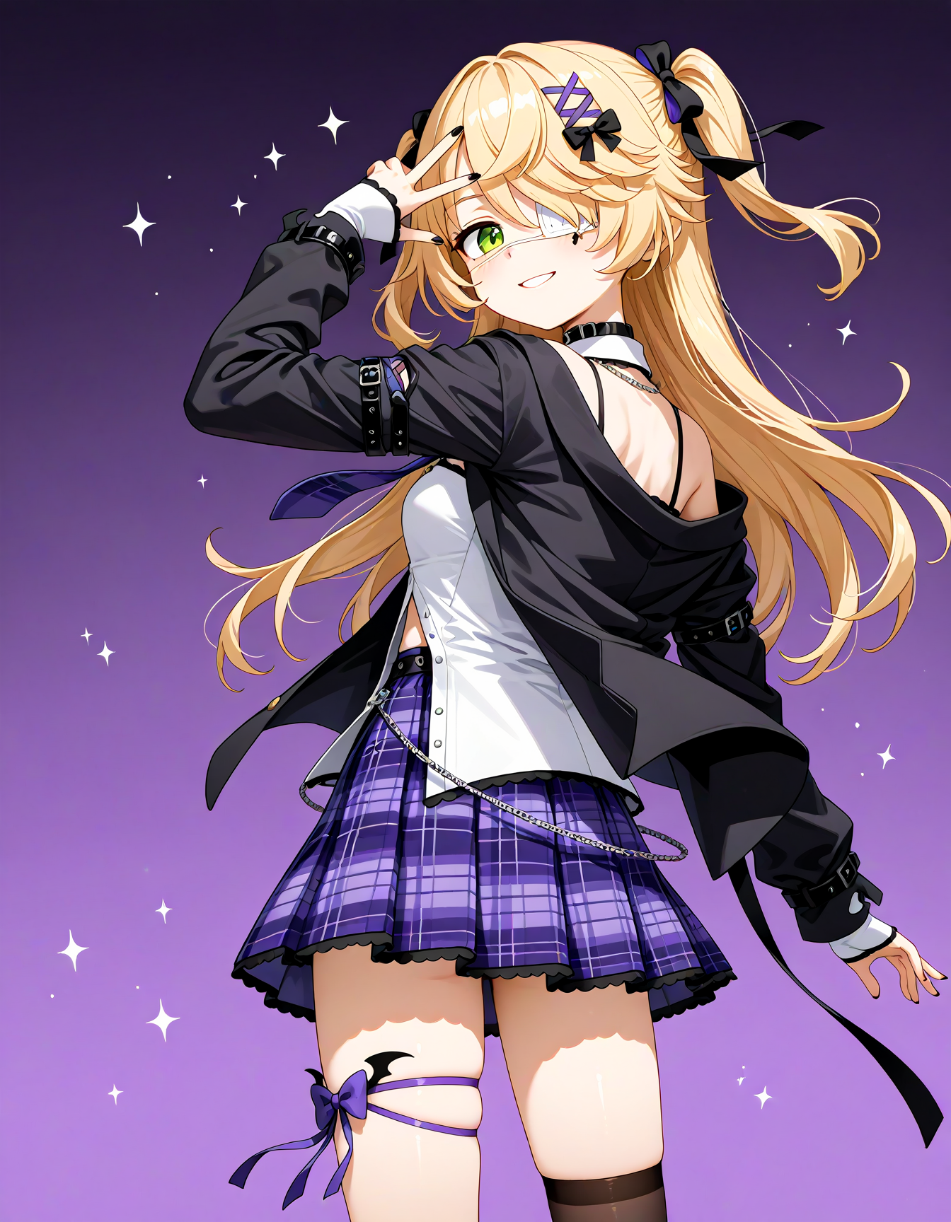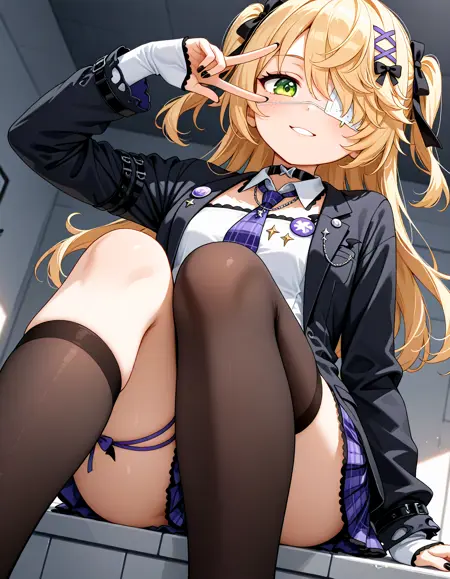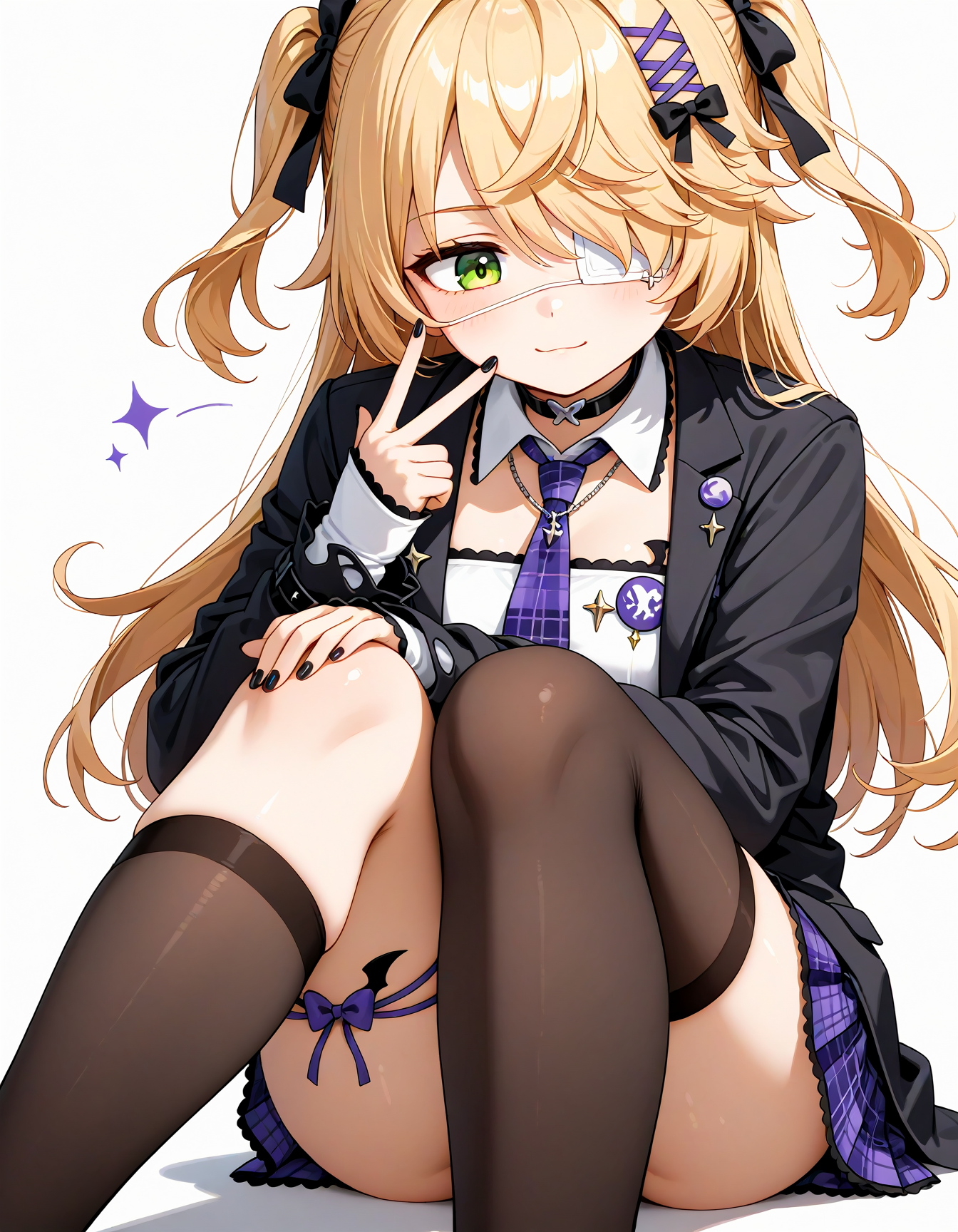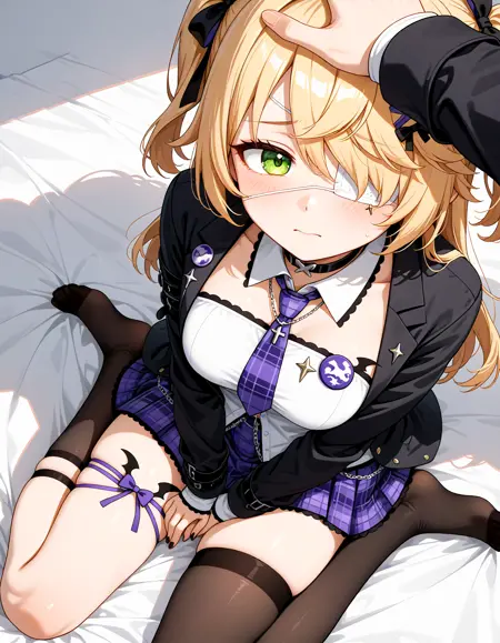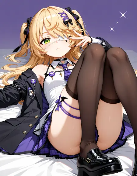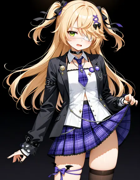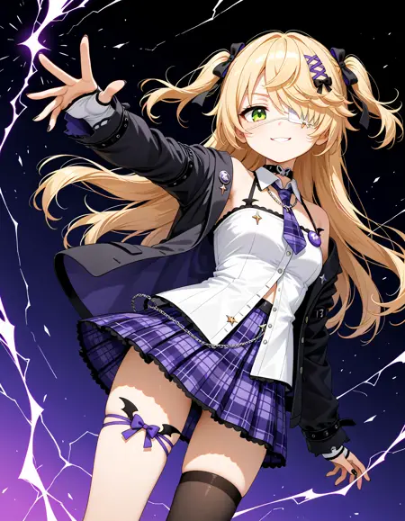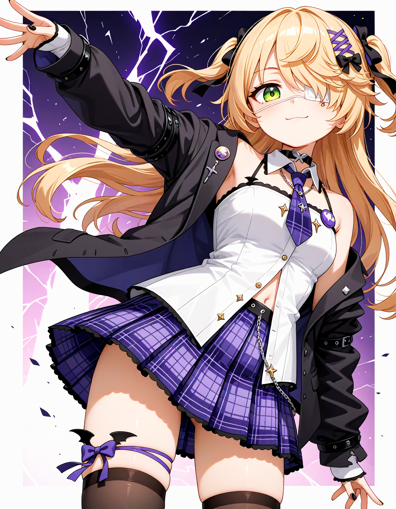 gcs_fischl, green eyes, white eyepatch, eyepatch, one eye covered, blonde hair, two side up, hair bow, black ribbon, x hair ornament, black nails, black jacket, open jacket, long sleeves, white shirt, purple skirt, purple necktie, black thighhighs, asymmetrical legwear, uneven legwear, thigh strap, collar, loafers, black footwear,
