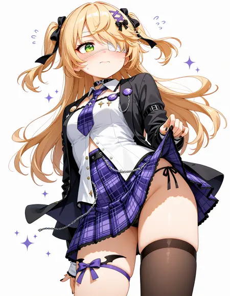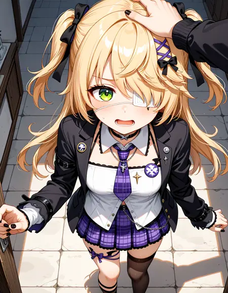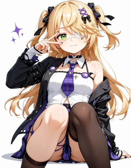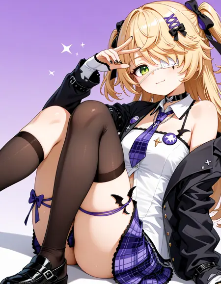 gcs_fischl, green eyes, white eyepatch, eyepatch, one eye covered, blonde hair, two side up, hair bow, black ribbon, x hair ornament, black nails, black jacket, open jacket, long sleeves, white shirt, purple skirt, purple necktie, black thighhighs, asymmetrical legwear, uneven legwear, thigh strap, collar, loafers, black footwear,