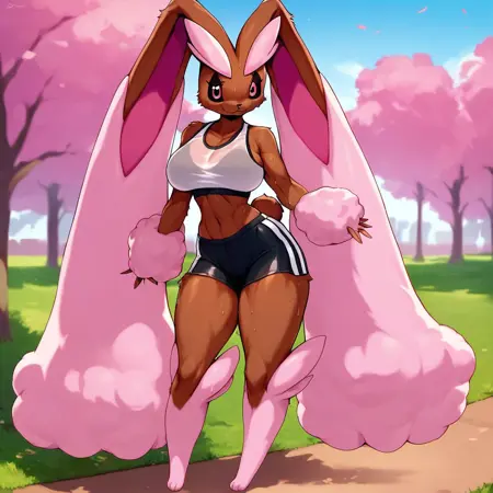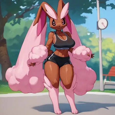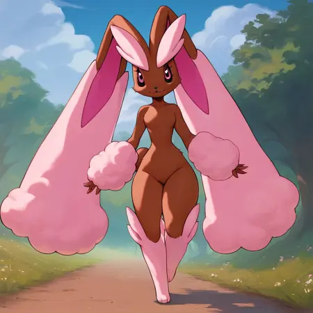 rabbit, lopunny, brown and pink fur, large eyebrows, black nose, large rabbit ears, fluffy ears, pokemon (creature), pink eyes, black sclera, fluffy hands, fluffy feet,