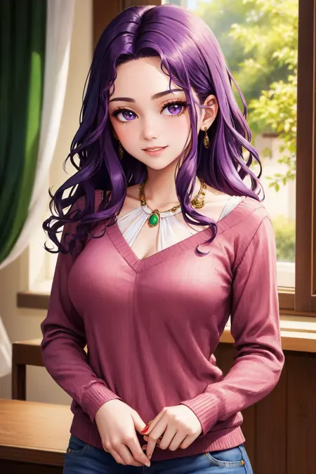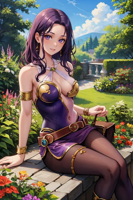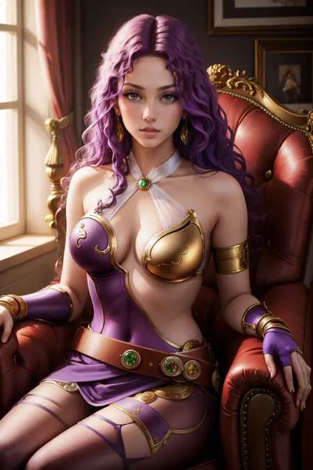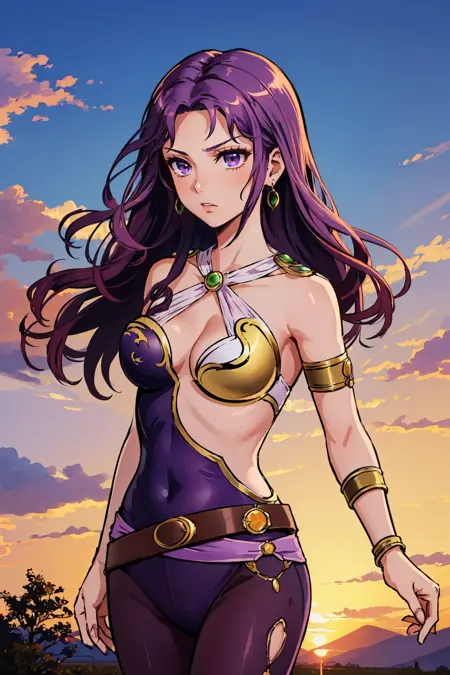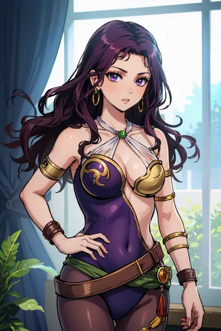 彼女の典型的な外見には、"クリーヴェージ、ボディスーツ、紫のパンティーストッキング、ベルト、イヤリング、アームレット" を追加してください。