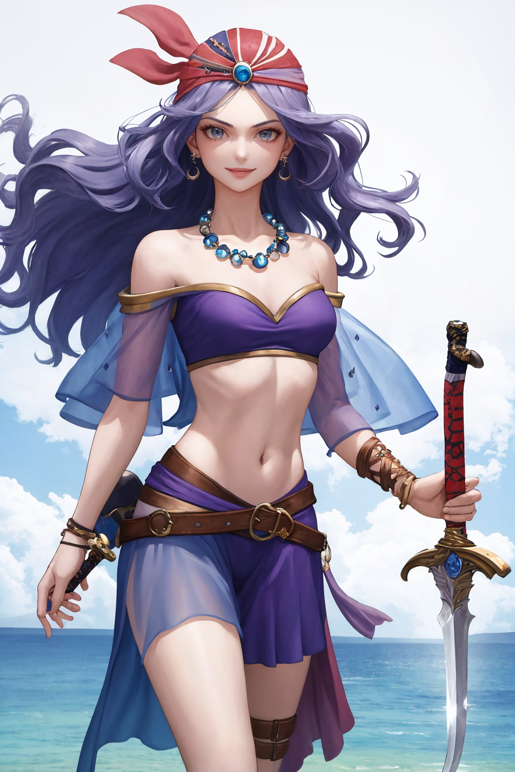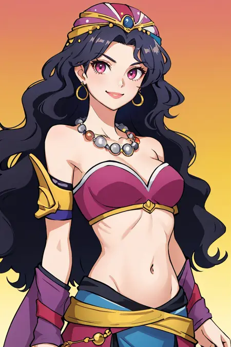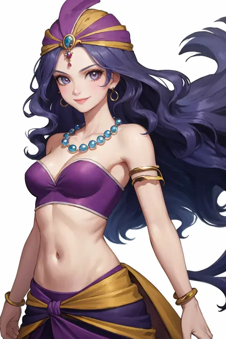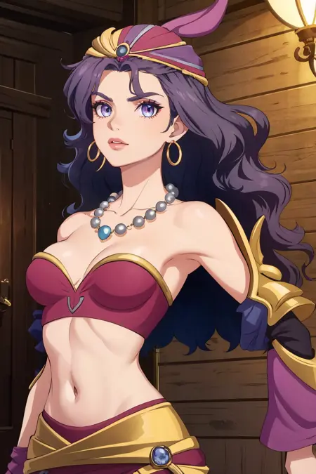 leila, wavy hair, midriff, navel,necklace, earrings, jewelry, single shoulder pad