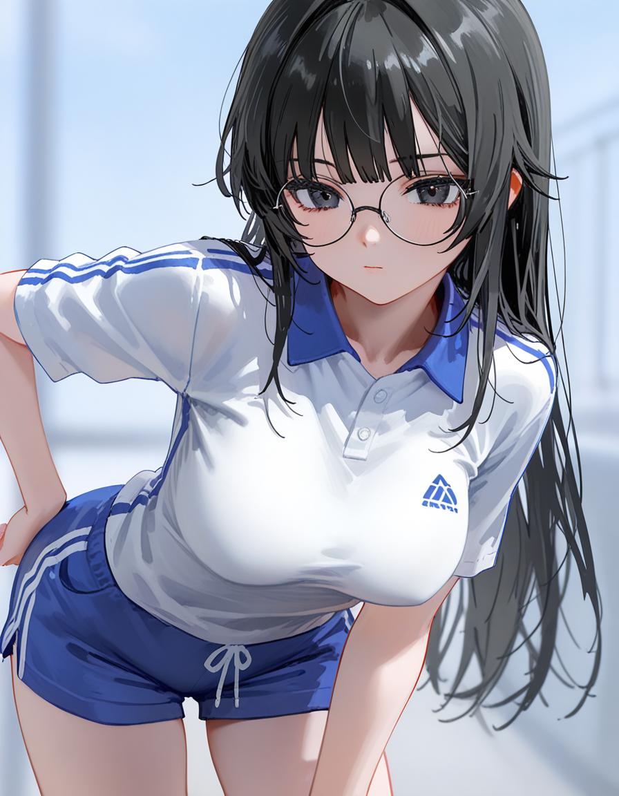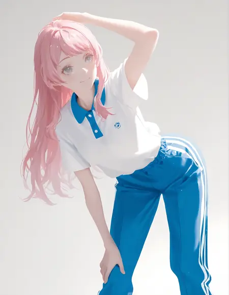其他帮助词:school uniform,collared shirt,blue collar,shirt,white shirt,short sleeves,pants,blue pants,