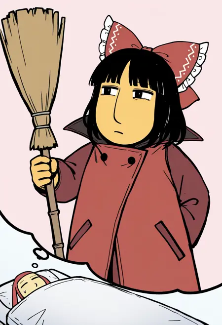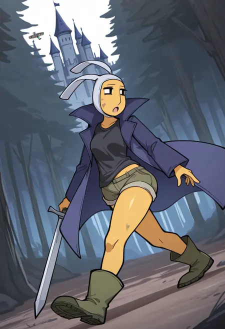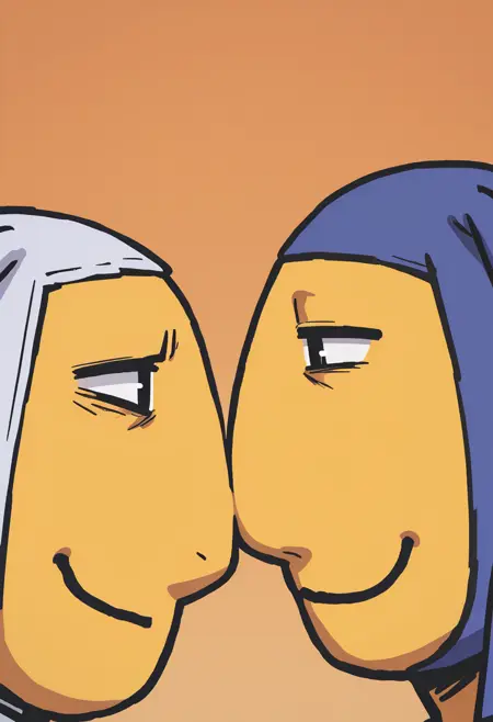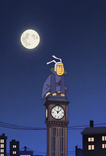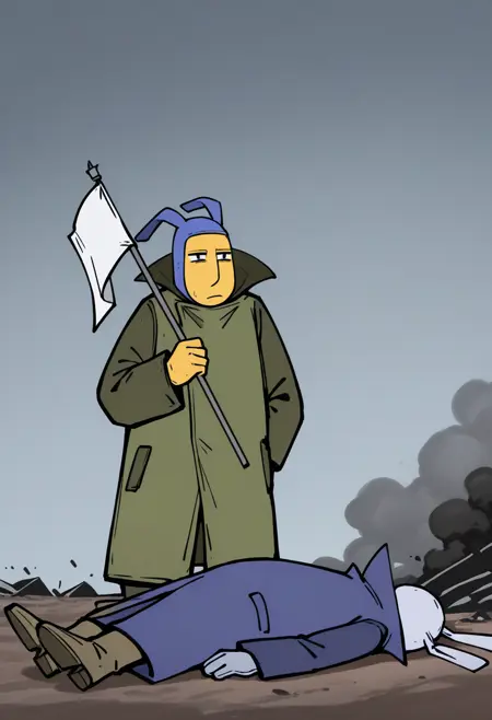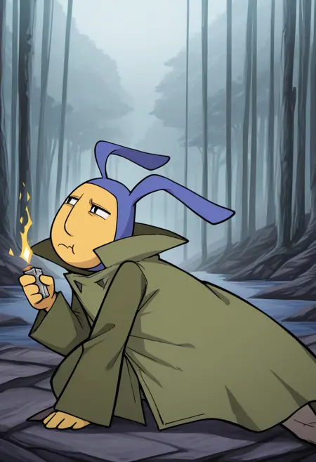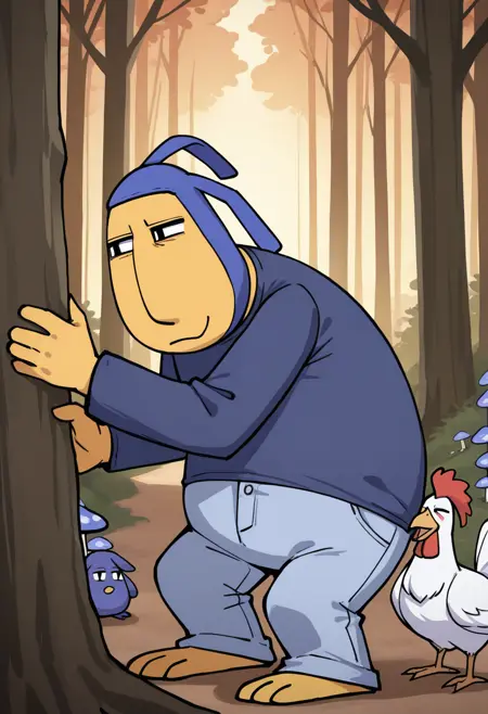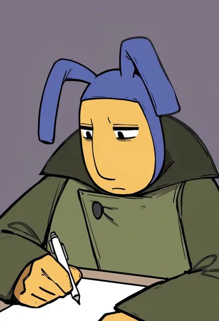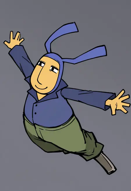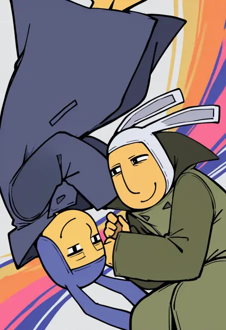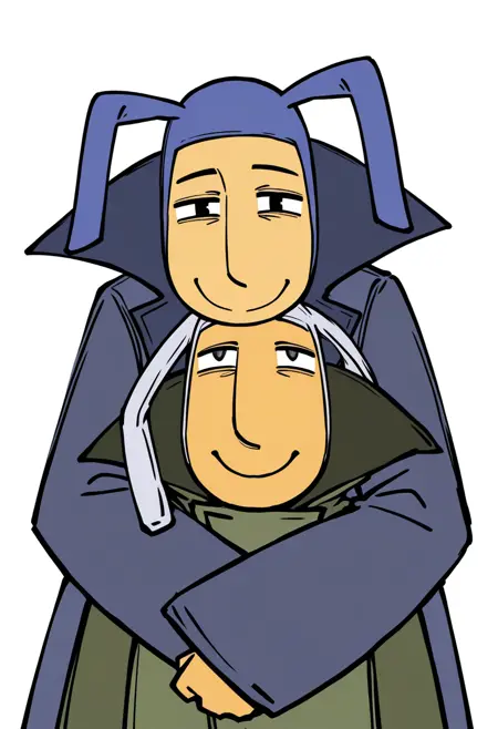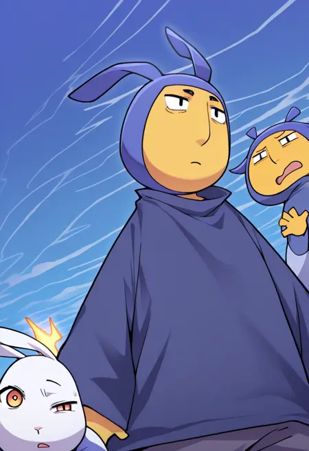 EzyとPetruchoはまったく同じである。私はそれぞれに特別なタグを設けていないが、帽子の耳の色で識別できる。Ezyは通常青いコートを着ており、Petruchoは緑色のコートを着ている。これはいくつかの問題を引き起こしたが、いずれにせよ発生していたであろう。illustroiusXLでは、地域プロンプトなしで、シーン内の特定のキャラクターに正確な服を指定するのが難しい。EzyとPetruchoが同時にシーンに登場し、両者が同じ色のコートを着ているようにしたい場合、運を待つ(または地域プロンプトまたはその類似物を使う)か、コートの色を諦めるしかない。さらに、訓練中にはPetruchoが青いTシャツを着ている画像がかなりあり、LoRAはコートの青色と耳のついた青い帽子を結びつけていた。オプションとして、各キャラクターに個別のタグを割り当て、服と強く紐付けることも可能だったが、私はこの方法を好まなかった。