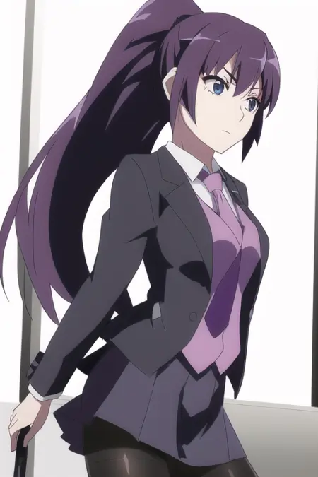 Hitagi Senjōgahara:1girl,solo,long_hair,blue_eyes,ponytail,purple_hair