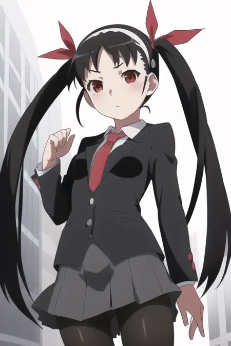 Mayoi Hachikuji:1girl,solo,long_hair,black_hair,red_eyes,ribbon,twintails,hair_ribbon,hairband