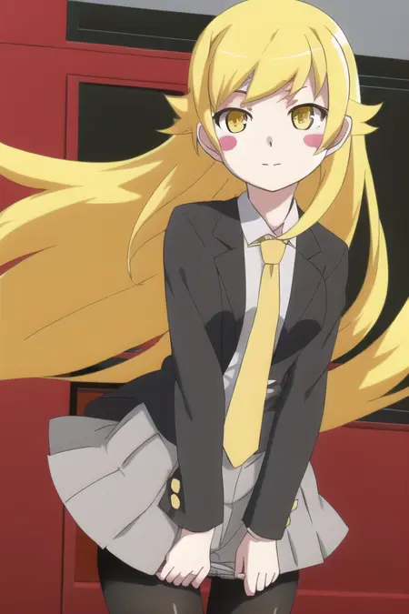 Shinobu Oshino:1girl,solo,long_hair,blonde_hair,yellow_eyes,blush_stickers