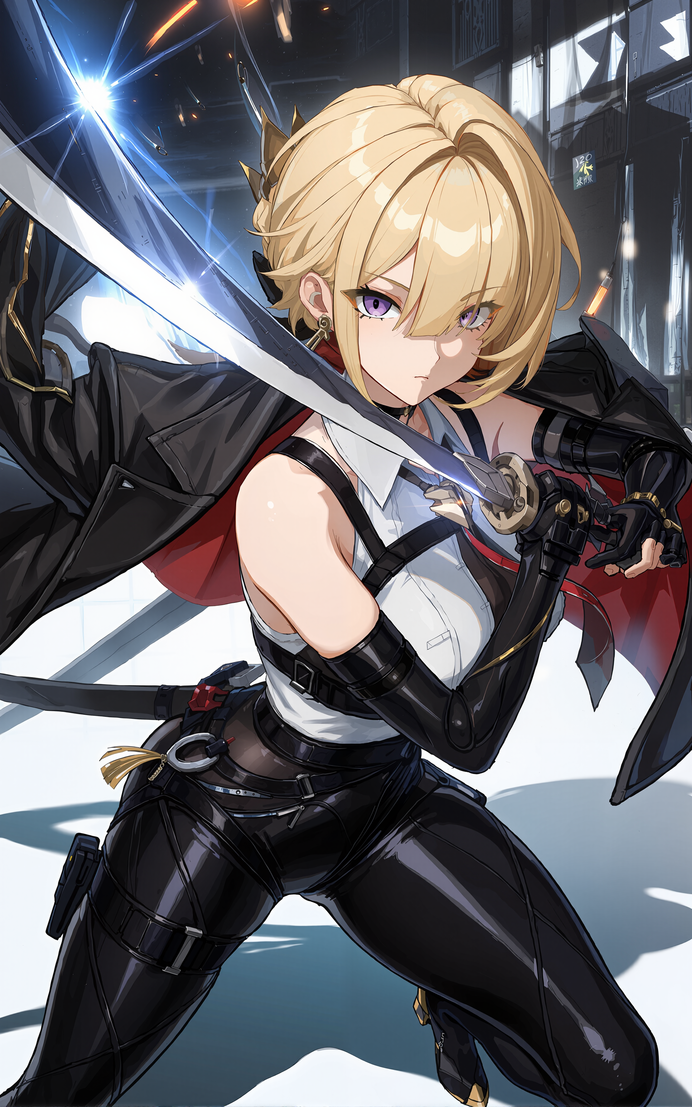 gloves,necktie,harness,black gloves,jacket,pants,jacket on shoulders,black pants,shirt,breasts,chest harness,black jacket,thigh strap,elbow gloves,choker,white shirt,collared shirt,sleeveless,black footwear,