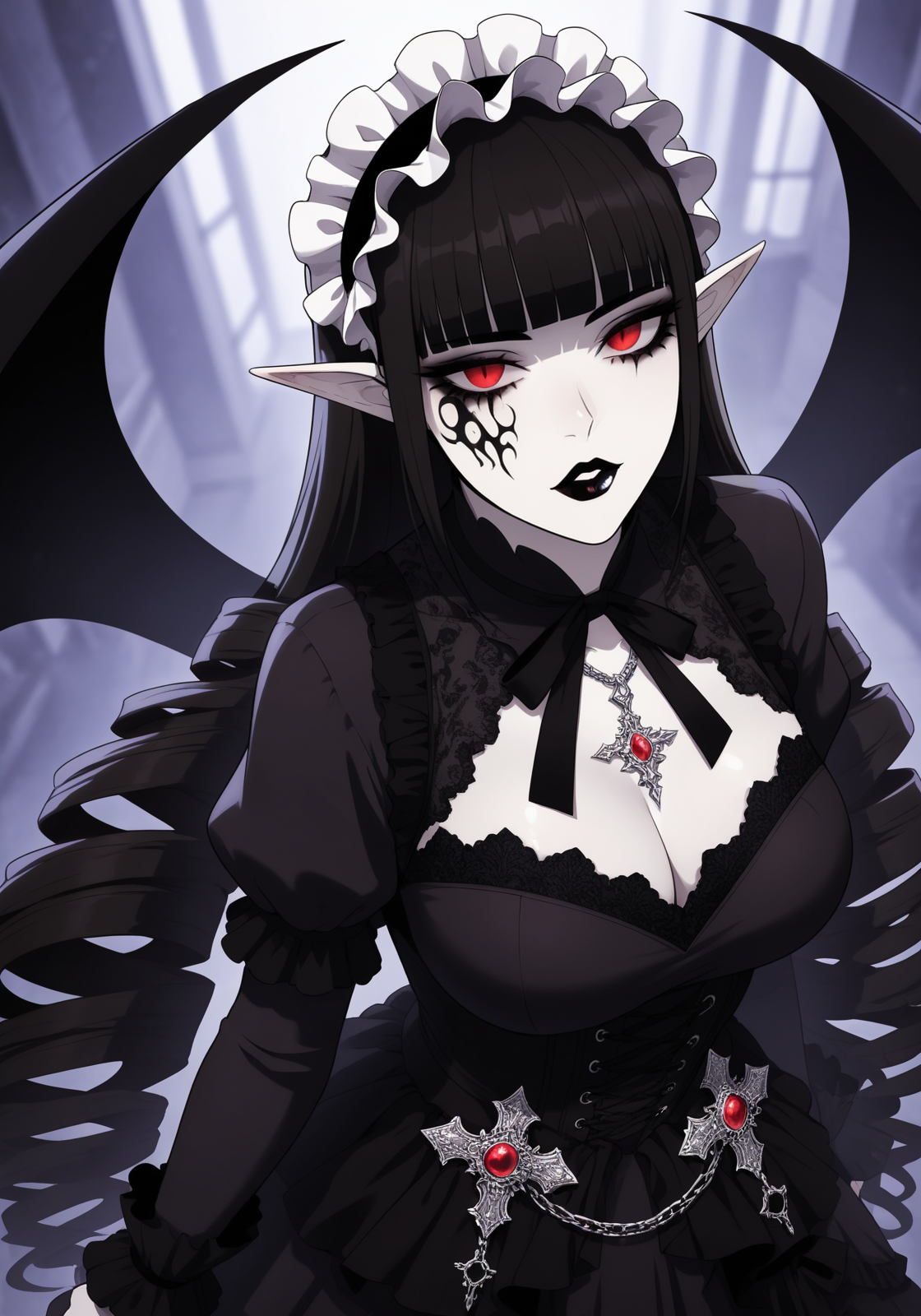 長い髪、黒髪、カール、顔のタトゥー、赤い目、ストレートな前髪、黒い口紅、黒い唇、白い肌、非常に長い髪、尖った耳、黒いブーツ、黒いドレス、胸元、メイドの帽子、ロングドレス、ゴシックファッション、ネックレス、羽
