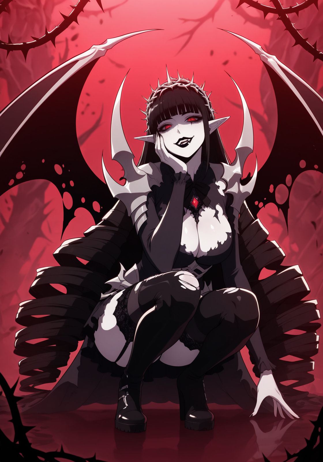 長い髪、黒髪、カール、赤い目、ストレートな前髪、黒い口紅、黒い唇、白い肌、レッグハイ、非常に長い髪、尖った耳、黒いレッグハイ、黒いブーツ、太ももブーツ、破れた服、ガーターストラップ、胸元、トゲのティアラ、ショートドレス、アーマー、羽