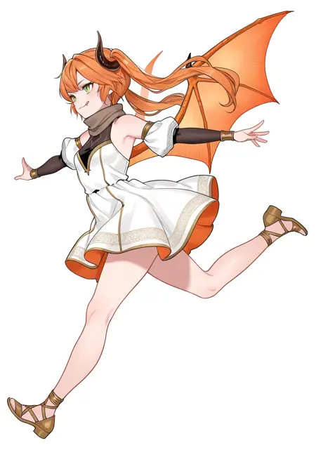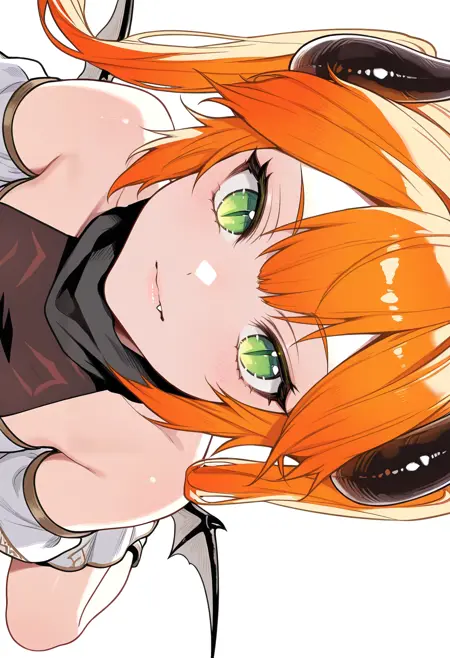 fey/cnn, 1girl, long hair, horns, twintails, wings, fang, slit pupils, orange hair, green eyes,