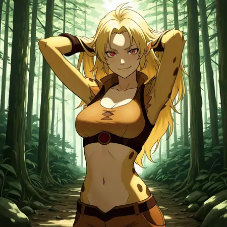 cheetara_tc, blonde hair, long hair, red eyes, pointy ears, crop top, navel