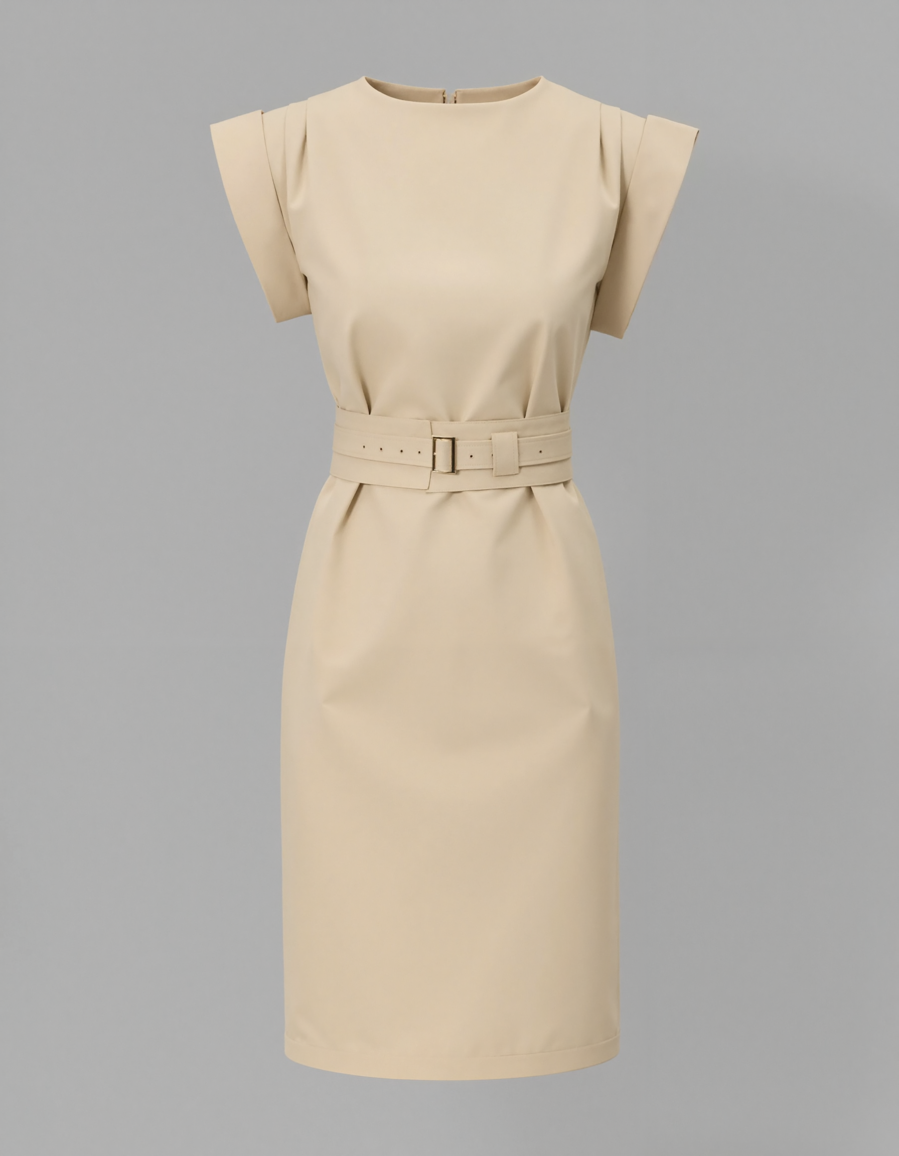 例:膝丈のベージュのドレス(短めのリボン袖とCharuel1218デザイン付き)