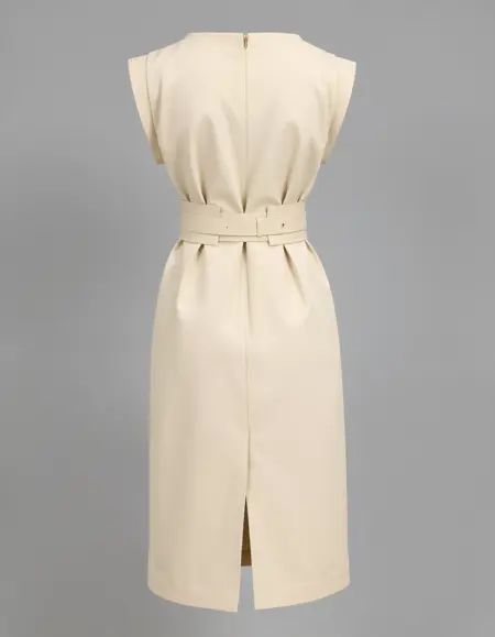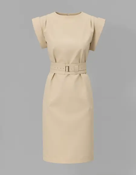似合うシルエット:膝丈のシースー型ドレスは、体型にフィットするカスタムメイドのデザインで、洗練さと着用しやすさをバランスよく両立しています。