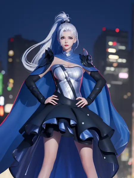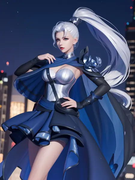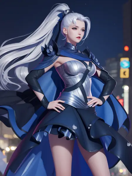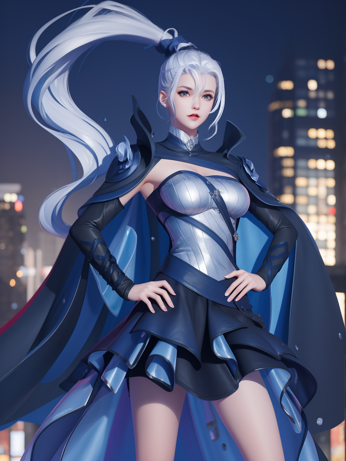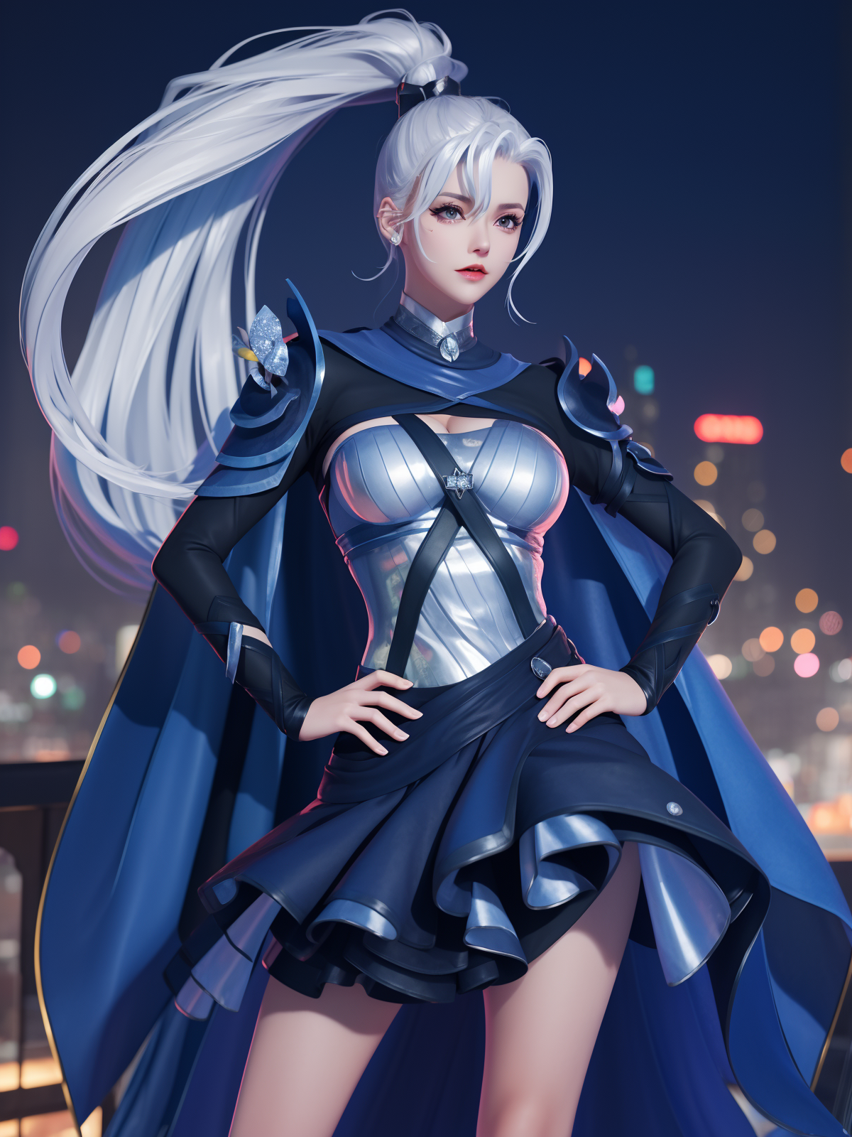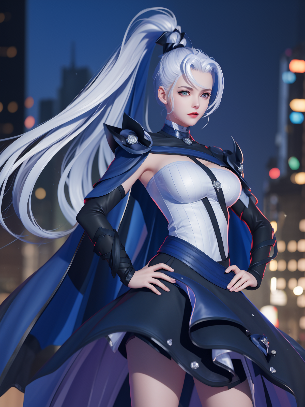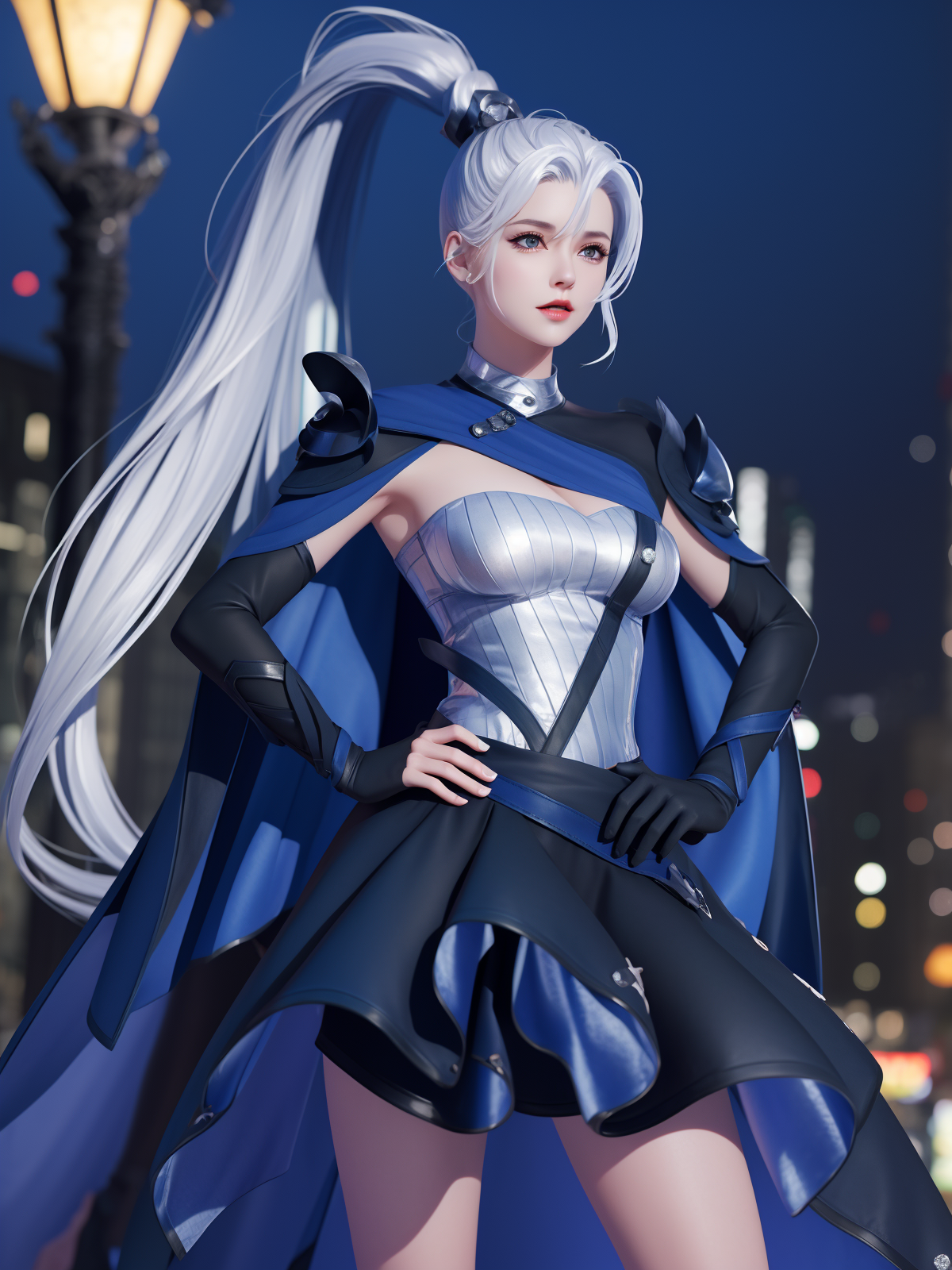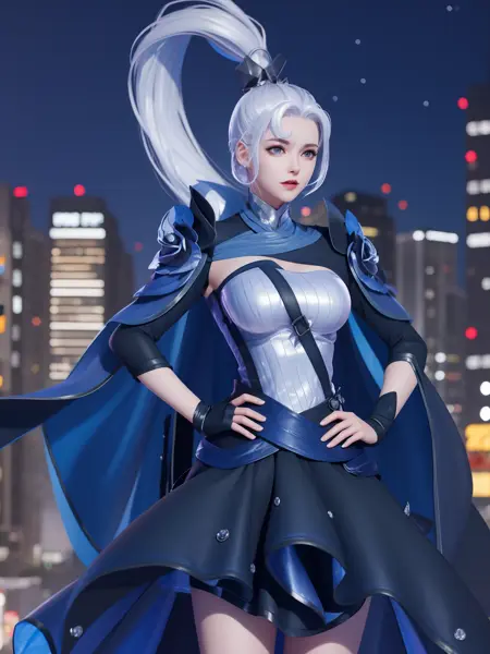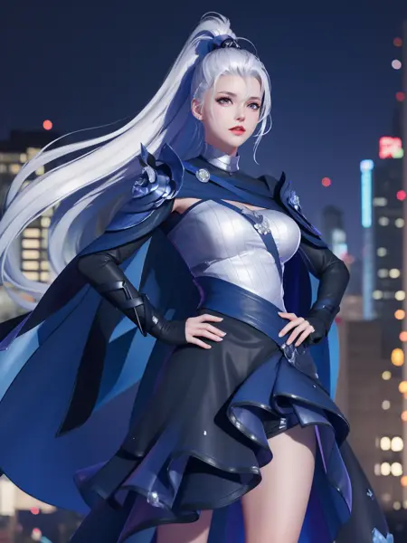 - WZRYhuamulanMQJF, 1girl, solo, long hair, jewelry, armor, blue eyes, blue hair, breasts, looking at viewer, dress, flower, thigh strap, single thighhigh, long sleeves, gloves, cityscape, night, high ponytail, hand on hip, belt,