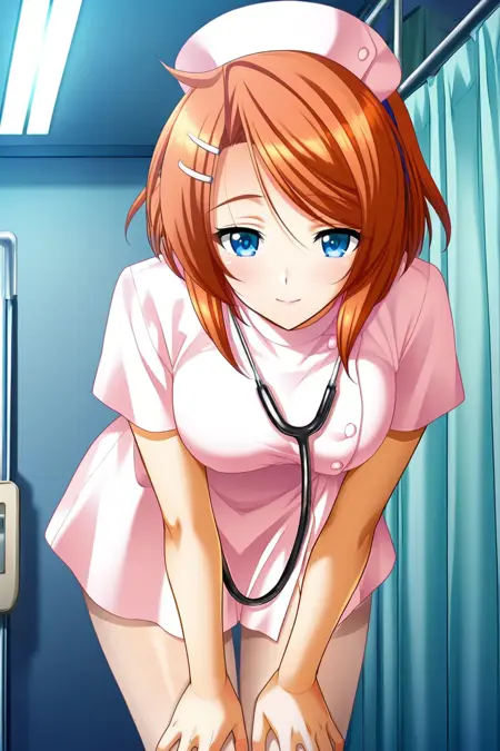 看護婦:オレンジ色の髪、サイドバンズ、短髪、teal の目、ヘッドバンド、髪飾り、看護婦、看護婦帽、聴診器、看護婦服、短袖、タイツ