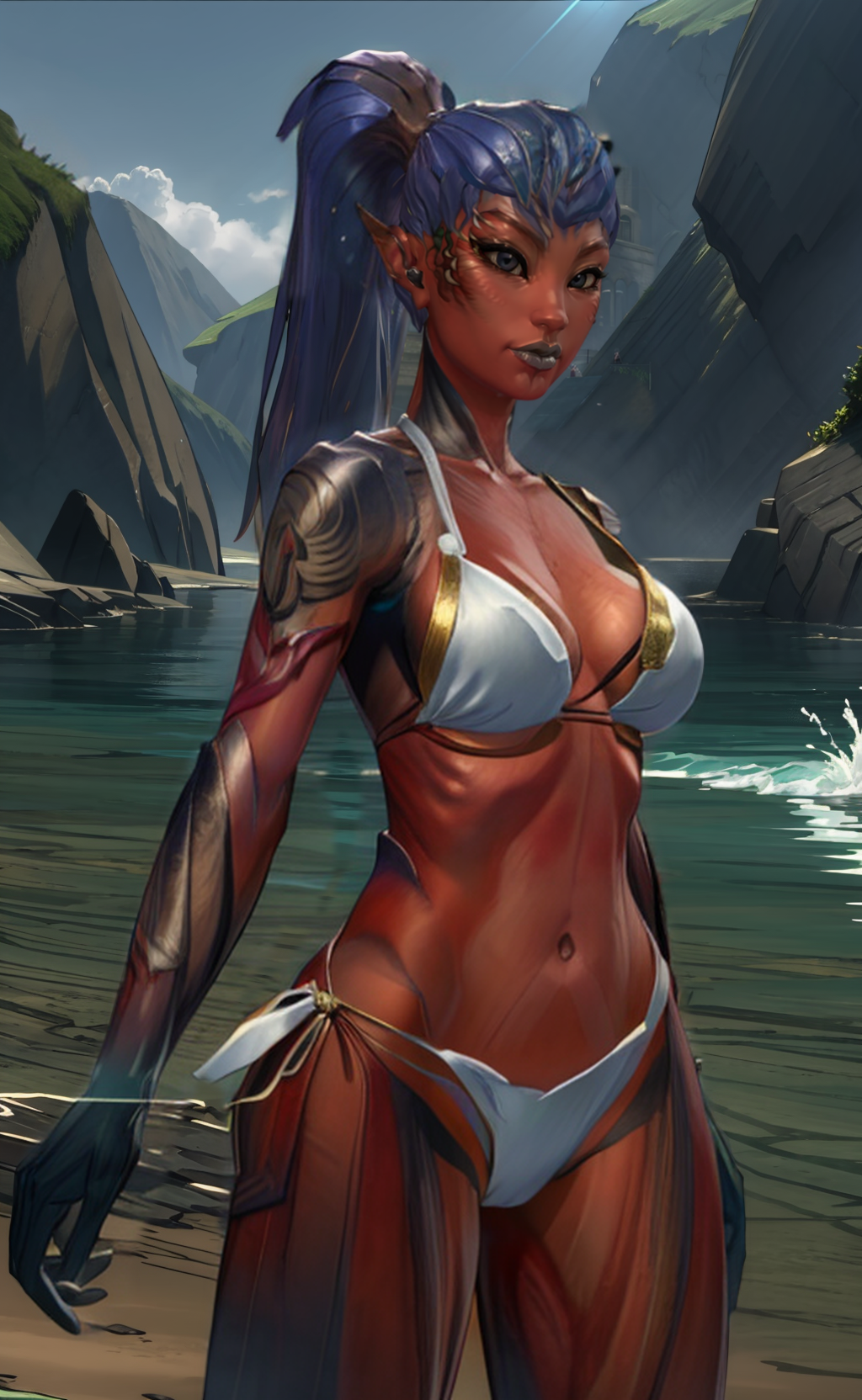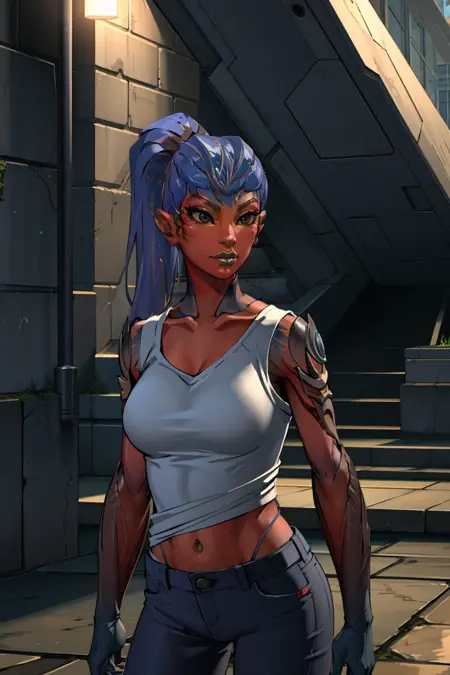 게임 내 내 캐릭터의 자르기된 8K 스크린샷을 사용하여 다양한 복장으로 만들었으며, “속옷”을 제거하기 위해 일부 인페인팅을 적용하여 어두운 파란 손이 장갑이 아니라 피부 색임을 모델이 이해하도록 했습니다. 어깨의 잎도 마찬가지입니다.