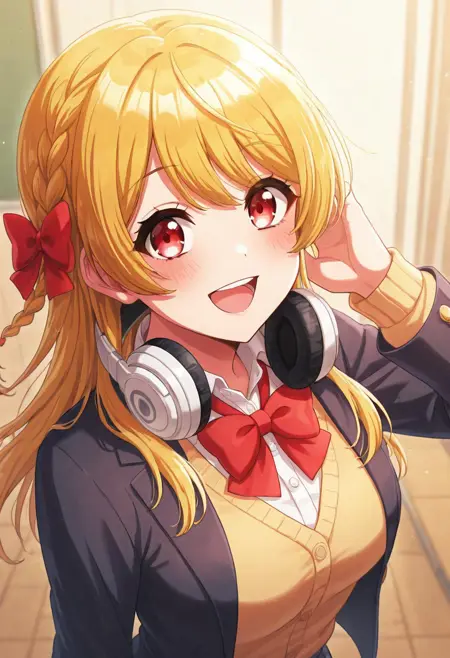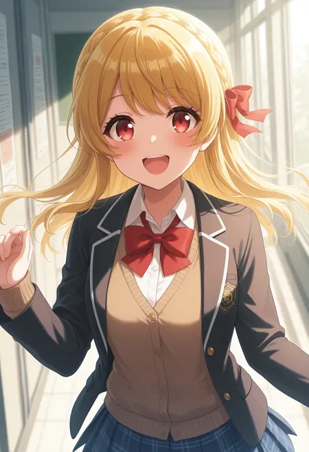 rkamt, long hair, blonde hair, red eyes, medium breasts, french braid