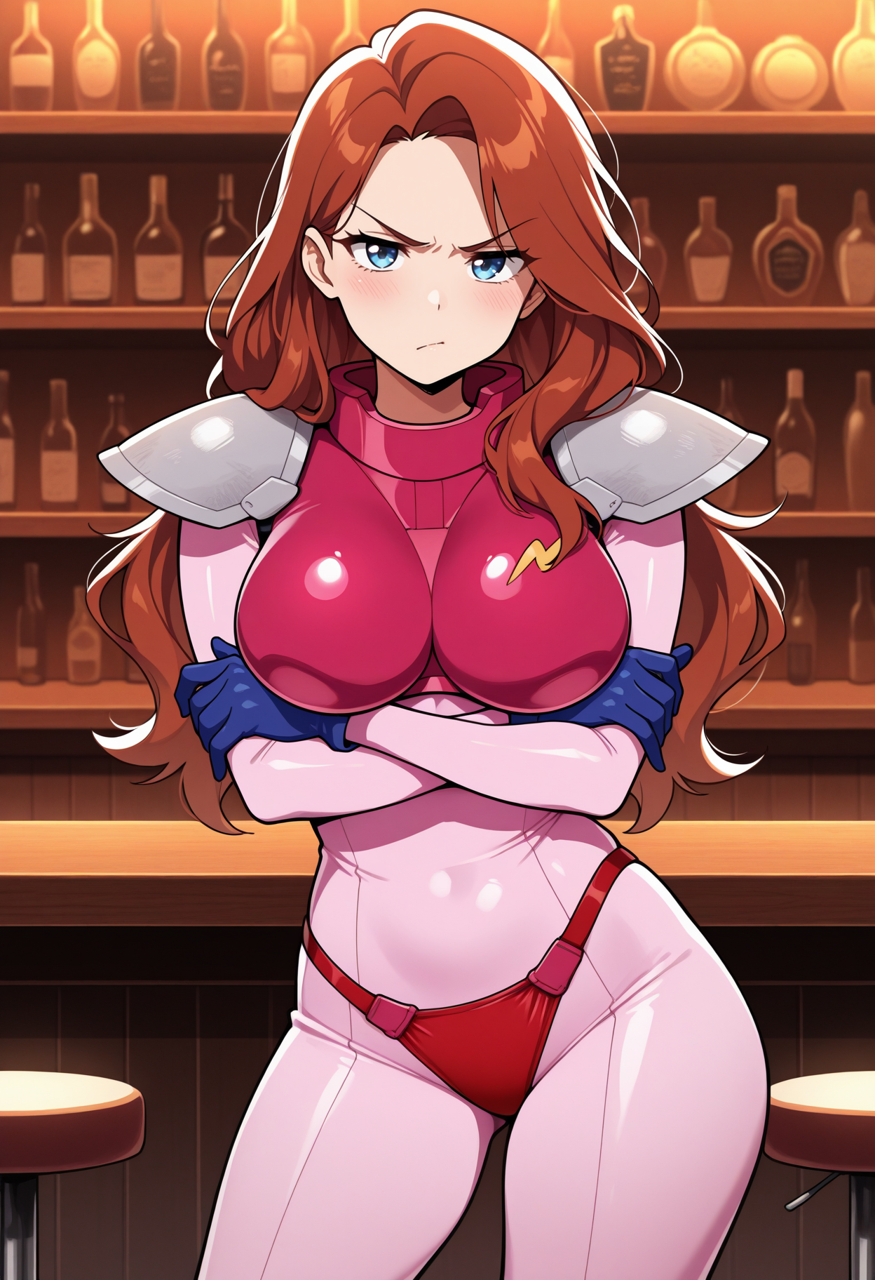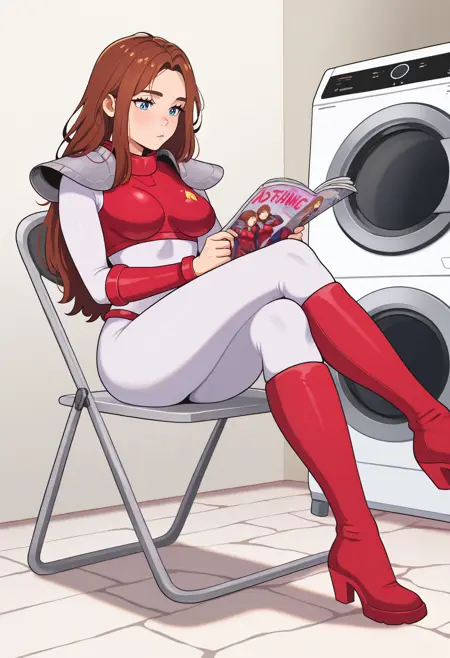 - Default appearance: j0dy, brown hair, long hair, blue eyes, pink bodysuit, red armor, boobplate, medium breasts, shoulder pads, blue gloves, red panties, knee boots, high heel boots, red footwear