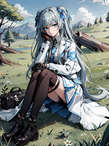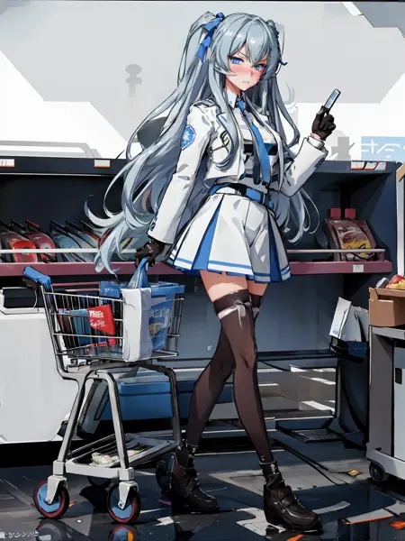 학교 유니폼, 흰 치마, 검정 허벅지 양말, 검정 장갑, 머리 리본, 검정 신발,