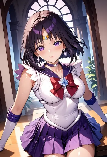トリガーワード: saturn_a_xl、ショートヘア、黒髪、ボブカット、紫の目、ティアラ、ジュエリー、イヤリング、紫のセーラー襟、紫のチョーカー、赤いリボン、セーラー戦士ユニフォーム、白シャツ、ノースリーブシャツ、紫のスカート、白い肘までグローブ、膝ブーツ,