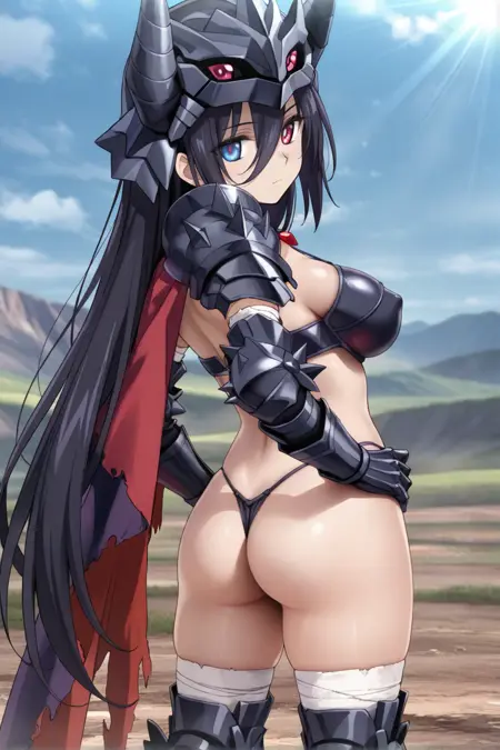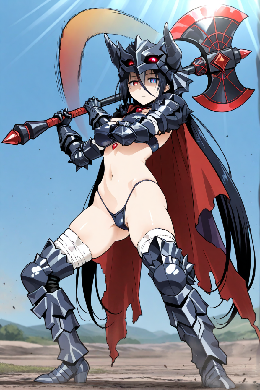 헬멧, 비키니 갑옷, 빨간 액세서리, 망토, 장갑, 갑옷 부츠, 붕대 감은 다리