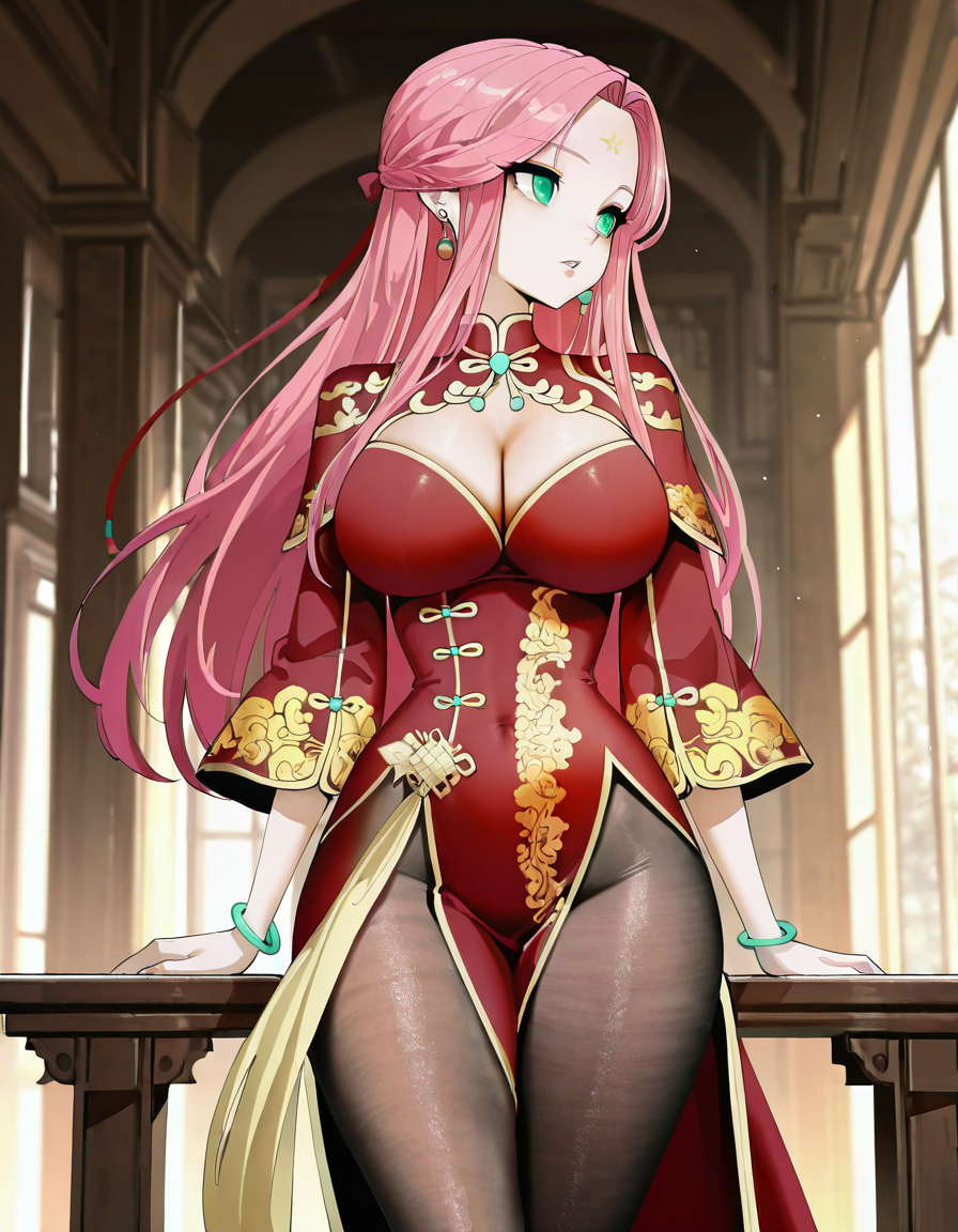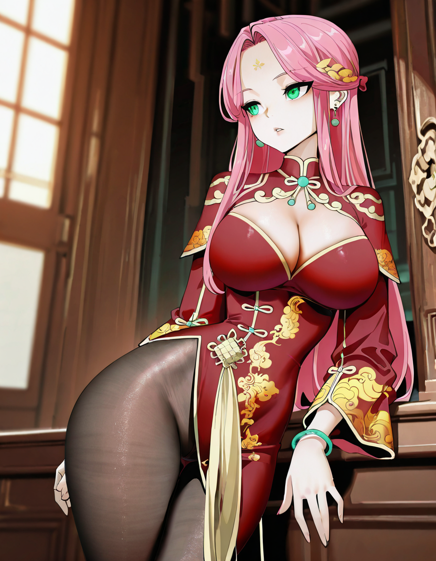 1girl, black_pantyhose, bracelet, breasts, cleavage, cleavage_cutout, clothing_cutout, dress, earrings, forehead_mark, green_eyes, jewelry, long_hair, long_sleeves, parted_lips, pink_hair, red_dress, solo, wide_sleeves, 夏洛特, red_footware