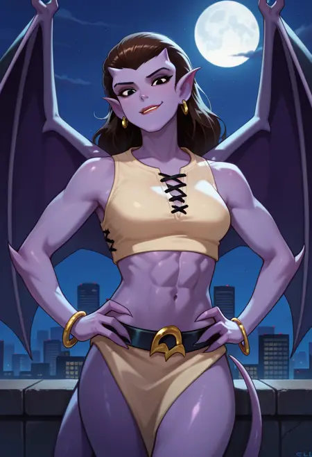 monster girl, purple skin, brown hair, long hair, black eyes, horns, pointy ears, makeup, earrings, wings, claws, tail,