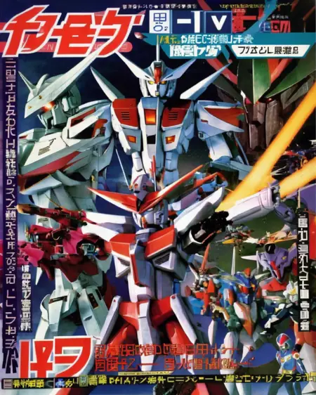 机甲狂潮:电视指南封面突出标志性的机甲动漫系列,如《超时空要塞》和《机动战士高达》,让读者沉浸于巨型机器人与星际战斗的世界中,机甲:0.7,科幻:0.5,史诗战斗:0.6,未来感:0.4,动作十足:0.6。