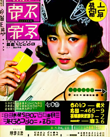 アイドル熱狂:松田聖子や中森明菜など1980年代のポップアイドルが輝く、J-popスターの華やかな世界への一瞬を約束するTVガイド表紙、アイドル文化:0.7、華やかさ:0.6、音楽:0.5、ノスタルジー:0.4、有名さ:0.6。