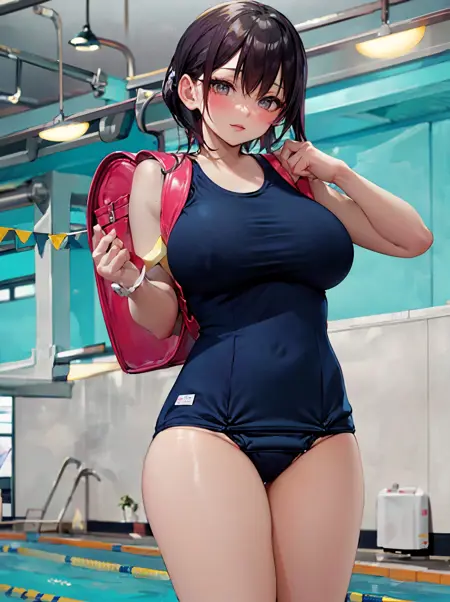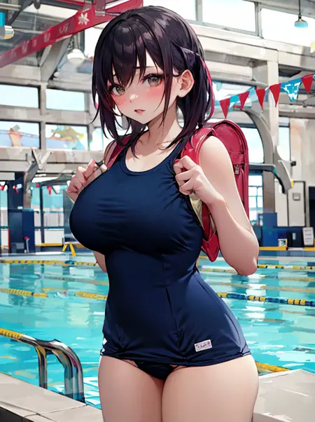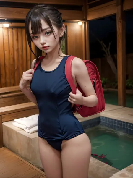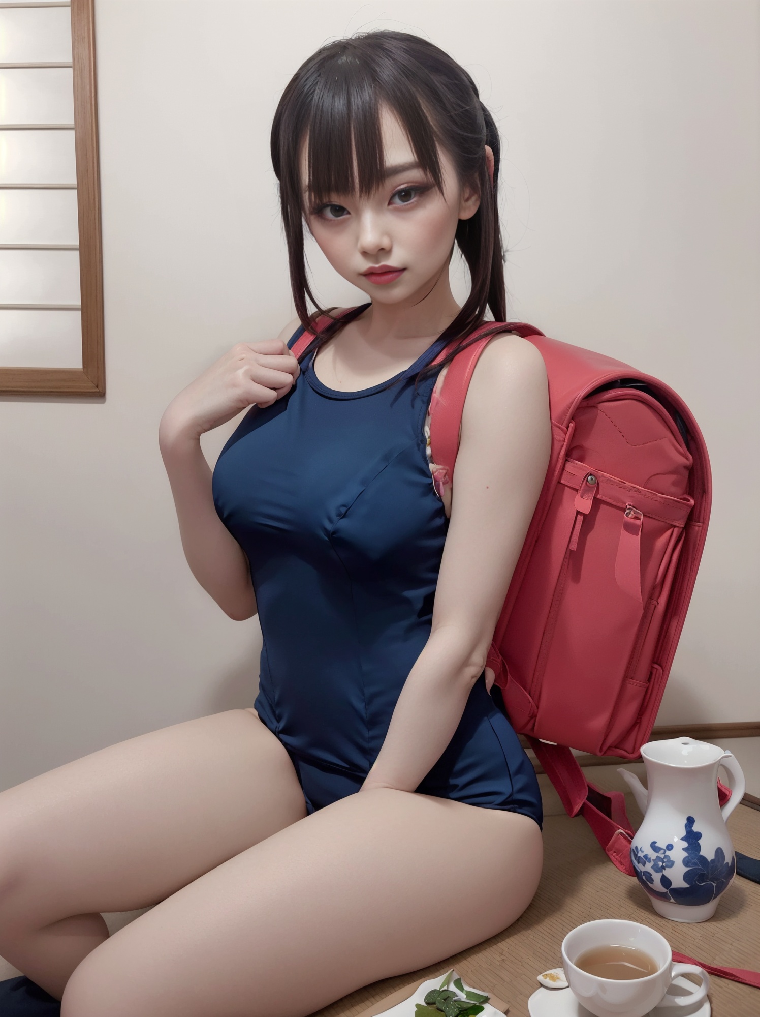 lora:randoserusukumizu_v1.3:1 携带ランドセル背包,身穿(深蓝色复古一体式学校泳装)