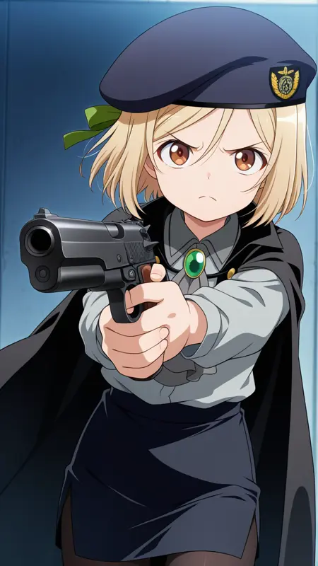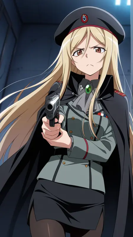 军事,军服,帽子,贝雷帽,黑色斗篷,绿色胸针,绿色宝石,黑色短裙,灰色衬衫,有领衬衫,灰色领结,绿色丝带,连裤袜,黑色连裤袜,铅笔裙,侧开衩,紧身衣,