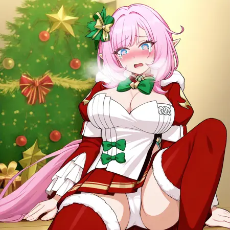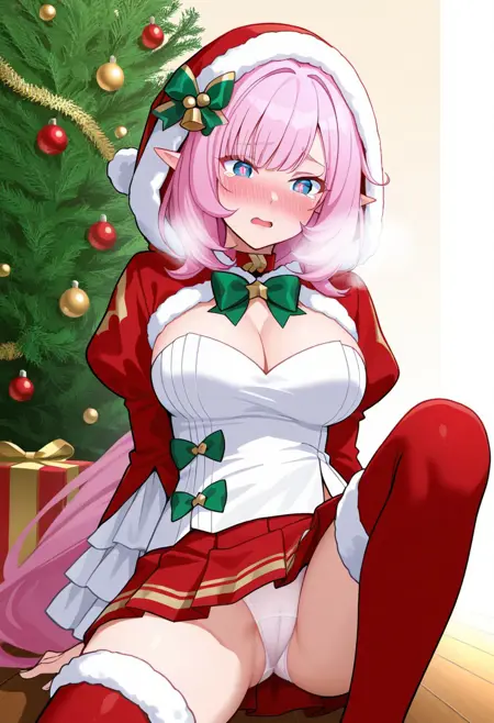 1girl, solo, ElyPinkElf, elf, blue eyes, pink pupils, pink hair, long hair, low ponytail, pointy ears, red and gold collar, gold and green christmas bowtie, white fur hoody, red and white shawl, puffy shoulders, frilly white sleeve, mistletoe, christmas decorations, white and red pleated shirt with green bows, strapless shirt, cleavage opening, red and gold pleated skirt, red thighboots with white fur trim
