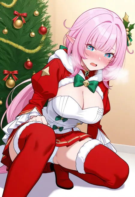1girl, solo, ElyPinkElf, elf, 파란 눈, 분홍 동공, 분홍 헤어, 긴 헤어, 낮은 토끼 꼬리, 뾰족한 귀, 빨간색과 금색 목걸이, 금색과 녹색 크리스마스 리본 넥타이, 흰색 모피 후oodie, 빨간색과 흰색 스카프, 볼륨 있는 어깨, 주름진 흰색 소매, 미슬토, 크리스마스 장식, 녹색 리본이 달린 흰색과 빨간색 주름 치마, 어깨가 드러난 셔츠, 가슴 열림, 빨간색과 금색 주름 치마, 흰색 모피 테두리가 있는 빨간색 허벅지 부츠