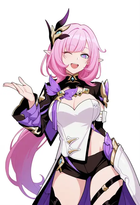 トリガー: 1girl, solo, ElyPinkElf, elf, blue eyes, pink pupils, pink hair, long hair, low ponytail, pointy ears
