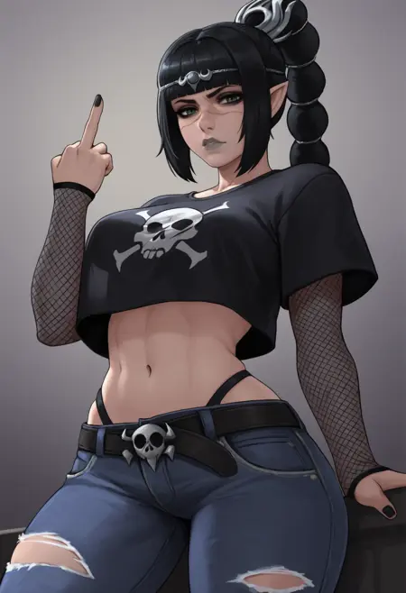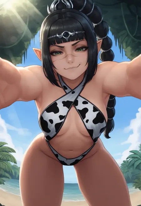 必须包含"shadef, 绿色眼睛, 黑色眼线, 雀斑, 尖耳朵, 长发, 发饰, 高马尾, 编织马尾, 中等胸围, 鼻子上的疤痕" 始终需要。