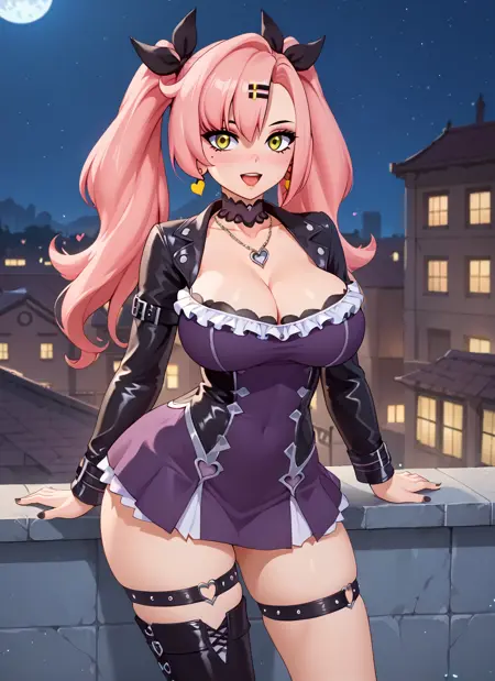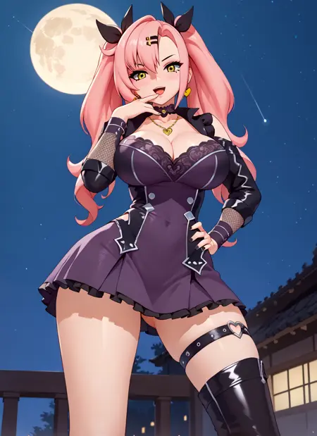 触发词:1girl,solo,3D,粉发,黄眼,双马尾,耳环,珠宝,黑色夹克,黑色短裤,黑色靴子腰带,白色背心,发夹,项链,大腿绑带