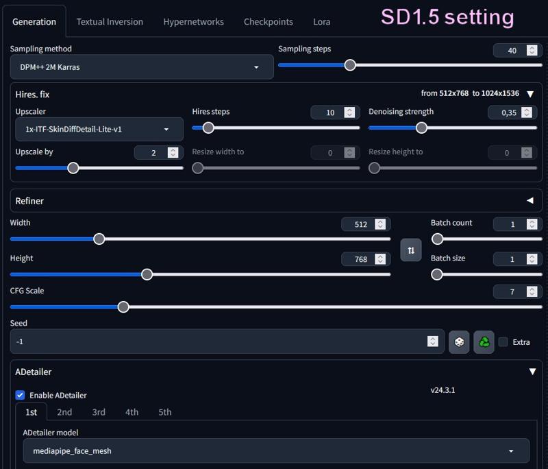 Setting : Sampling DPM Karras, HiresFix on, ITF-skinDiffDetail-Lite at 2x, Denoising 0.38, Upscale 2x, Sampling steps 35+, Resolution 512x768, Upscale 2x ITF-skinDiffDetail-Lite next passage.