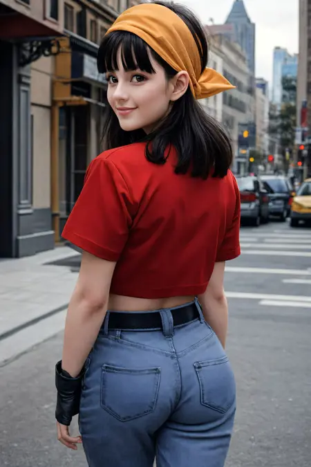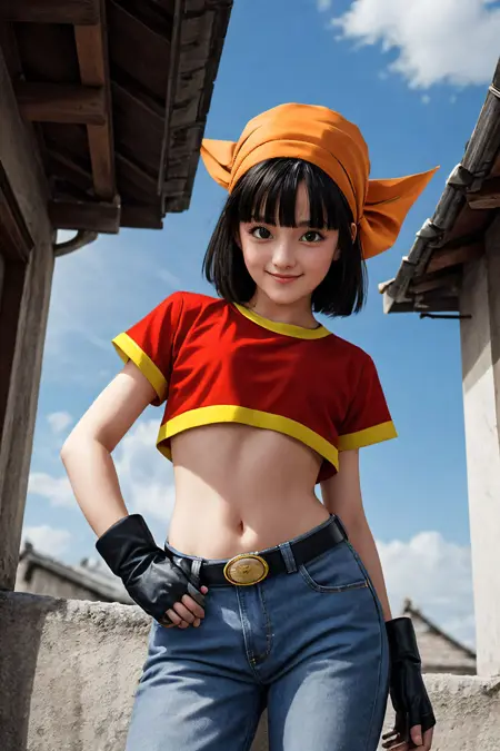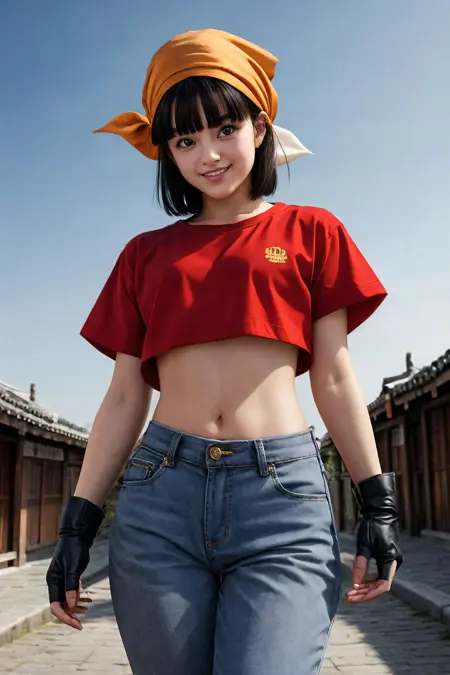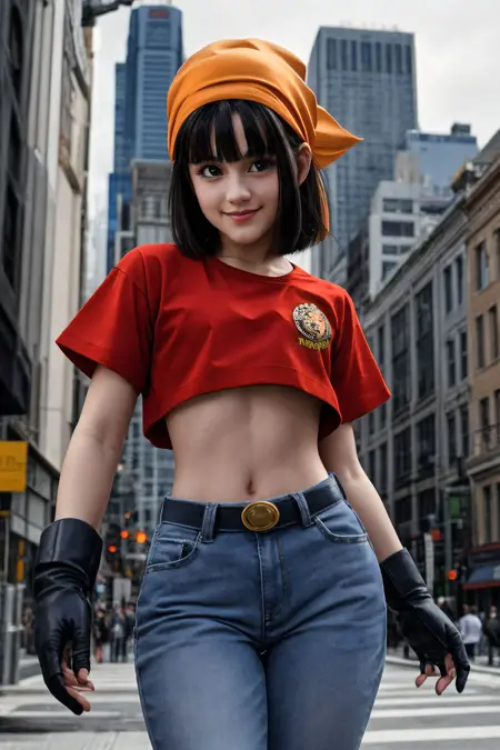 SD Positive prompt (PAN DBGT) : LORA, realistic, masterpiece, realistic, detailed, 8k, 1girl, beautiful photography of pan, black eyes, short hair, black hair, red shirt, crop top, orange bandana, black gloves, parted bangs, short pants, long eyelashes, slim body, hourglass body shape,big thighs, petite girl,,,..