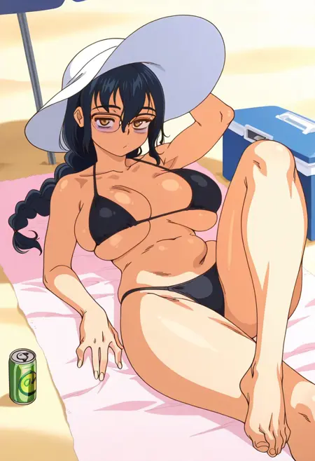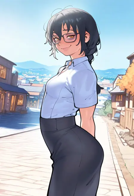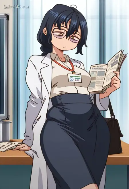 1girl, reiko_kirishima, dark blue hair, glasses, single braid ponytail, amber eyes, bags under eyes