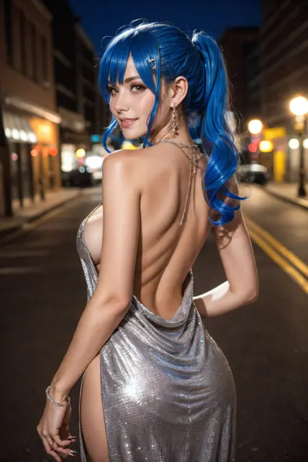 SD 포지티브 프롬프트: LORA, realistic, masterpiece, realistic, detailed, 8k, 1girl, beautiful photography of st. louis (azur lane), side ponytail, blue hair, sidelocks, bangs, long hair, hair ornament, hairclip, silver dress, halter dress, evening gown, plunging neckline, cleavage, bare shoulders, revealing clothes, jewelry, necklace, bracelet, earrings,..