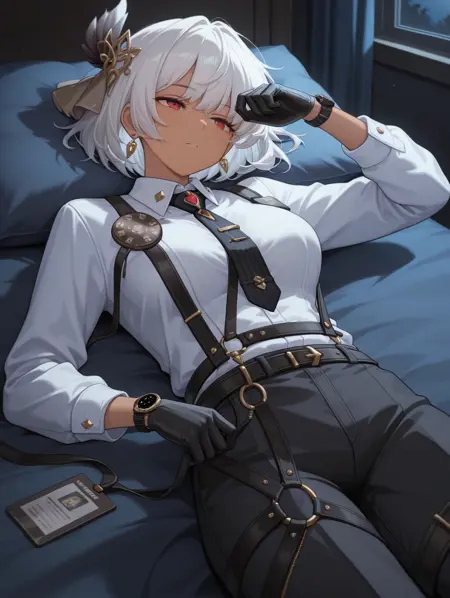 帕尔瓦蒂,1个女孩,手套,裤子,衬衫,红眼睛,白衬衫,黑手套,深色皮肤,领带,手表,黑裤子,腰带,白发,短发,深色皮肤女性,有领衬衫,发饰,长袖,珠宝,背带,黑色领带,耳环,发带,