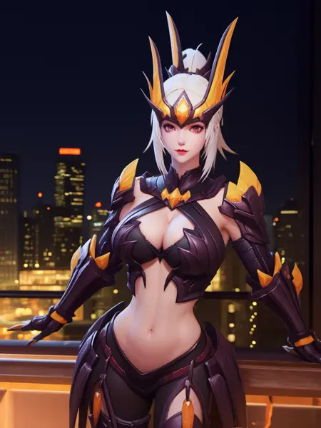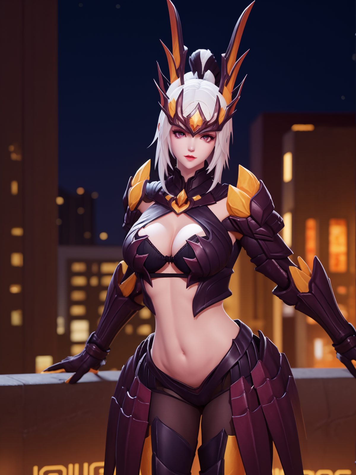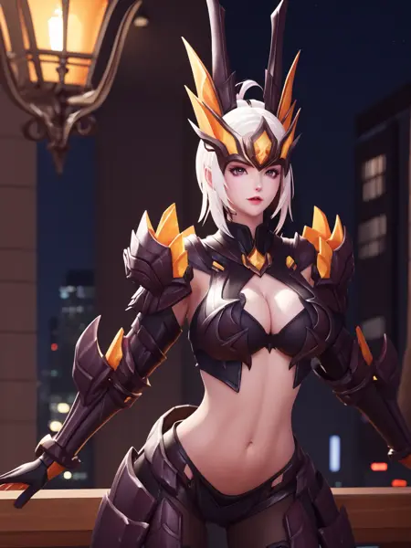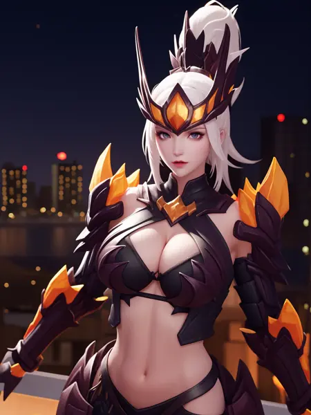 • WZRYhuamulanSJLLZ, 1girl, solo, navel, breasts, armor, white hair, clothing cutout, looking at viewer, medium breasts, gauntlets, midriff, boots, hair ornament, cityscape, night, high ponytail, forehead protector, hand on hip, pantyhose,