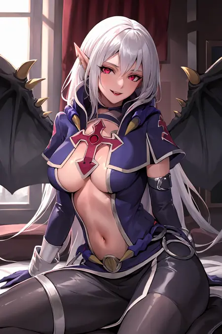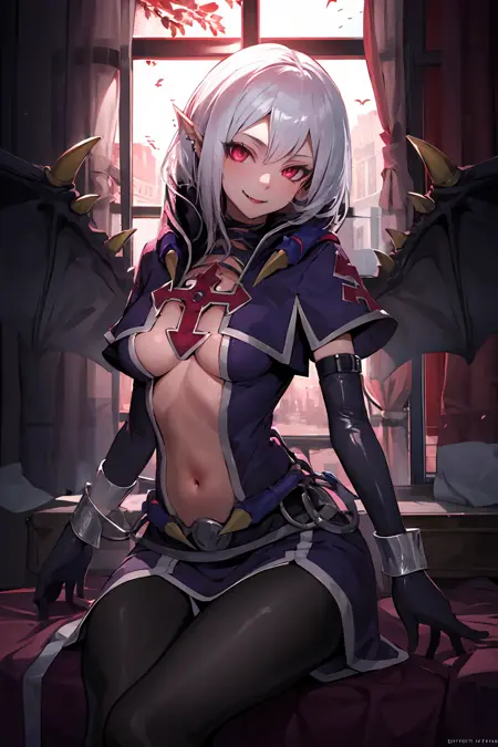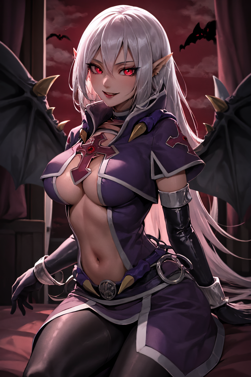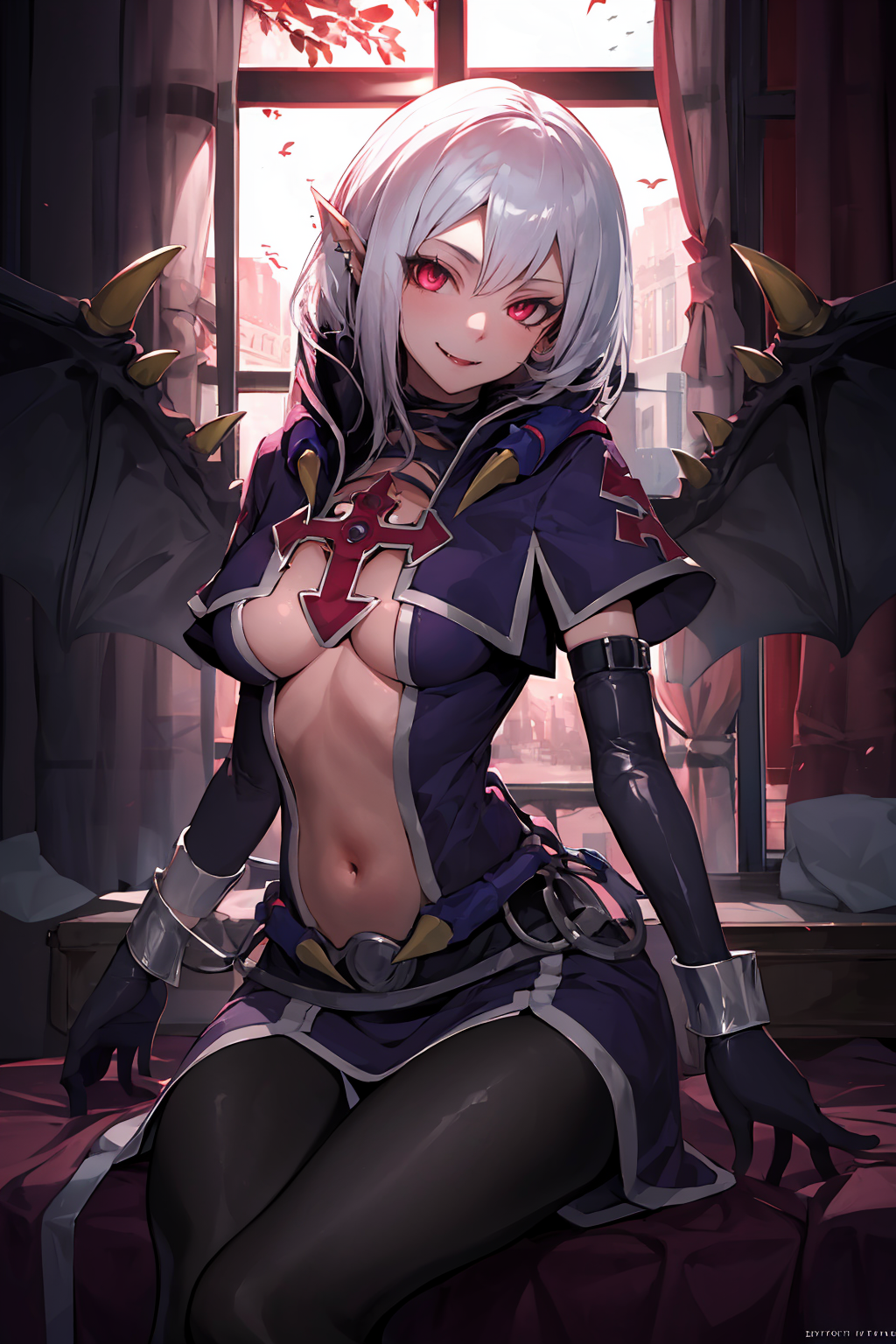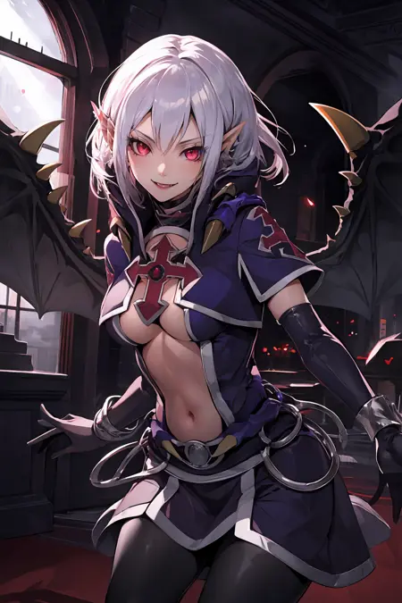 tags: vampire vamp, 1girl, clothing cutout, navel, wings, pointy ears, cross, elbow gloves, red eyes