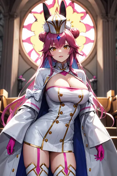 bbkoyans, long hair, double bun, fox ears, hat, white headwear, cleavage, large breasts, white dress, white coat, open coat, long sleeves, pink gloves, buttons, white thighhighs, garter straps