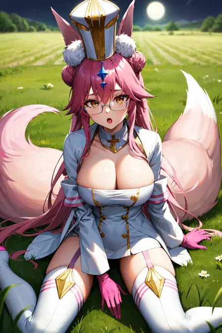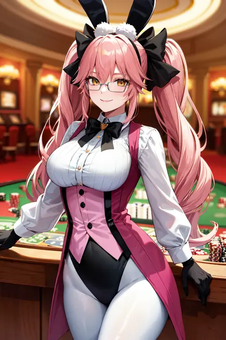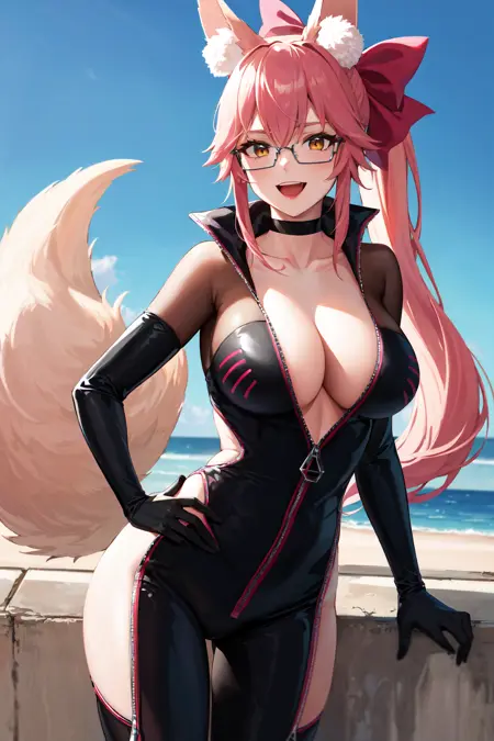 aakoyans, long hair, ponytail, pink bow, animal ears, glasses, large breasts, fox tail, choker, collarbone, cleavage, black bodysuit, see-through sleeves, long sleeves, black gloves, elbow gloves, hip vent