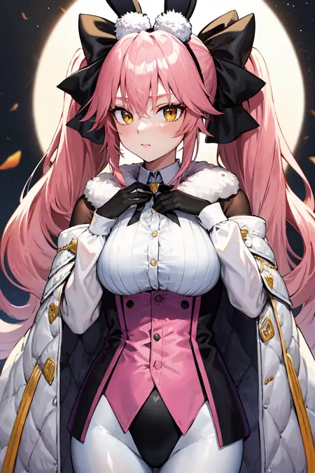 cckoyans, long hair, twintails, hair bow, black bow, rabbit ears, glasses, large breasts, white cloak, collared shirt, white shirt, dress shirt, leotard, long sleeves, black gloves, underbust, corset, coattails, white pantyhose