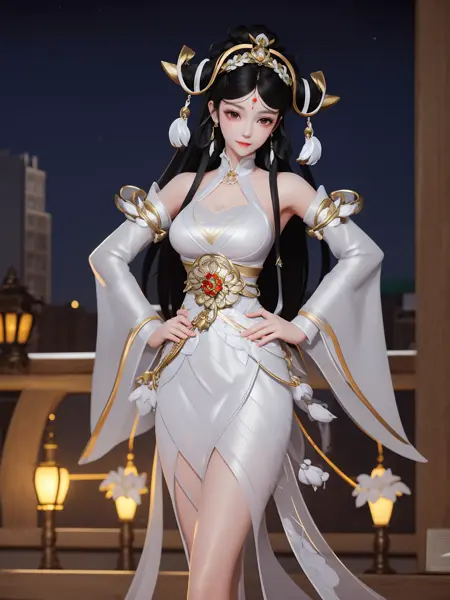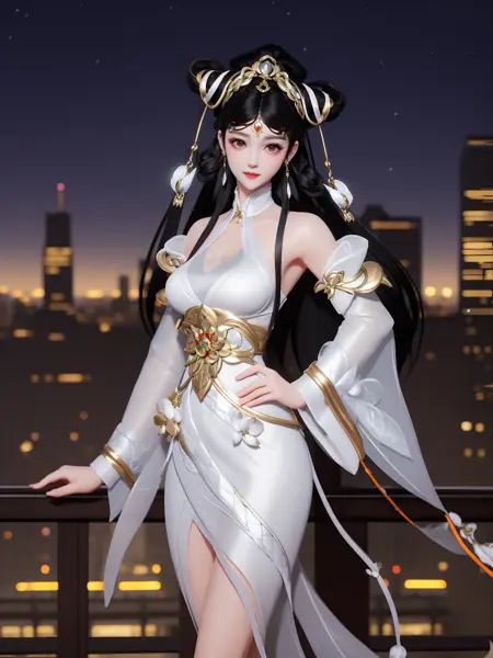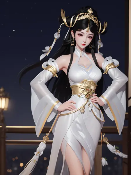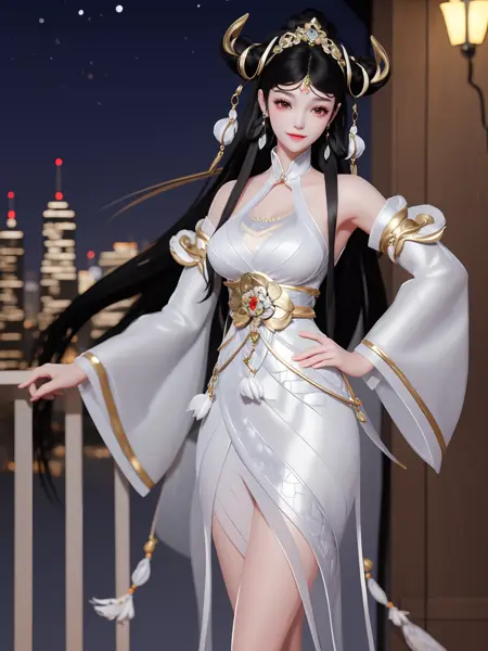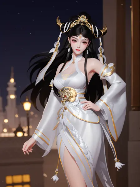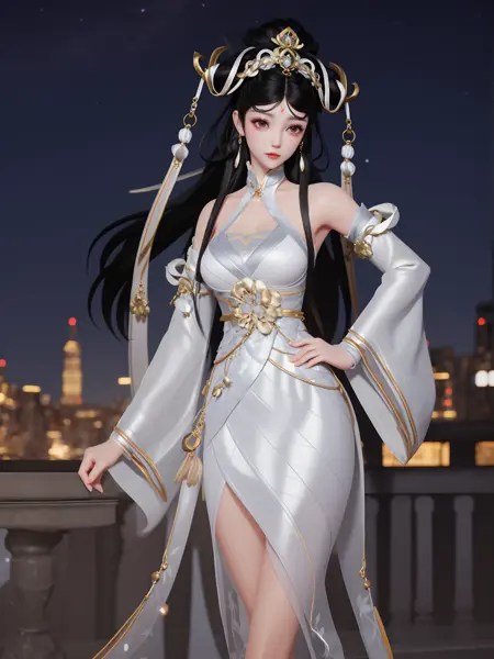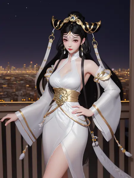 • WZRYdaqiaoBS, 1girl, black hair, solo, long hair, white dress, detached sleeves, hair ornament, jewelry, earrings, looking at viewer, forehead mark, ribbon, cityscape, night, mature female, hand on hip, light smile,